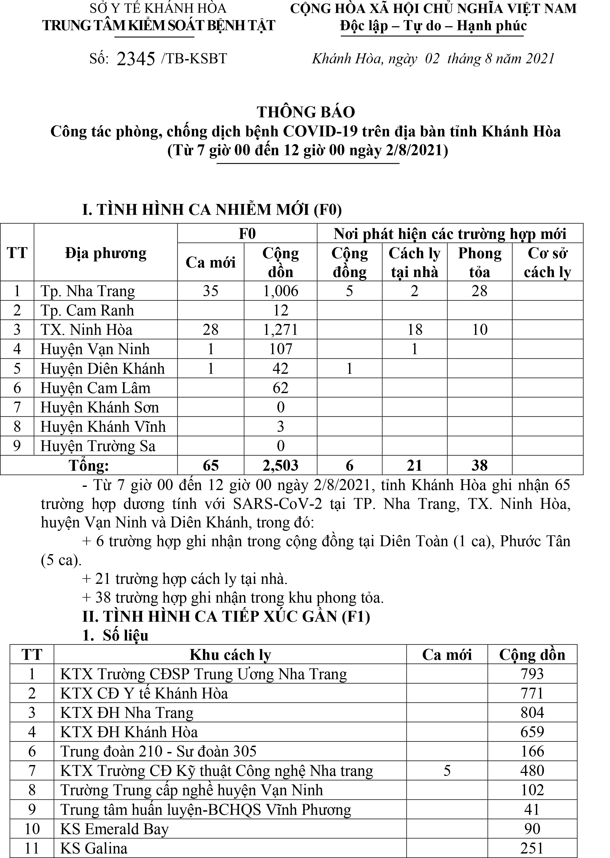 Trưa 2-8, theo Trung tâm Kiểm soát bệnh tật tỉnh Khánh Hòa, từ 7 giờ đến 12 giờ cùng ngày, toàn tỉnh ghi nhận thêm 65 trường hợp dương tính với SARS-CoV-2.