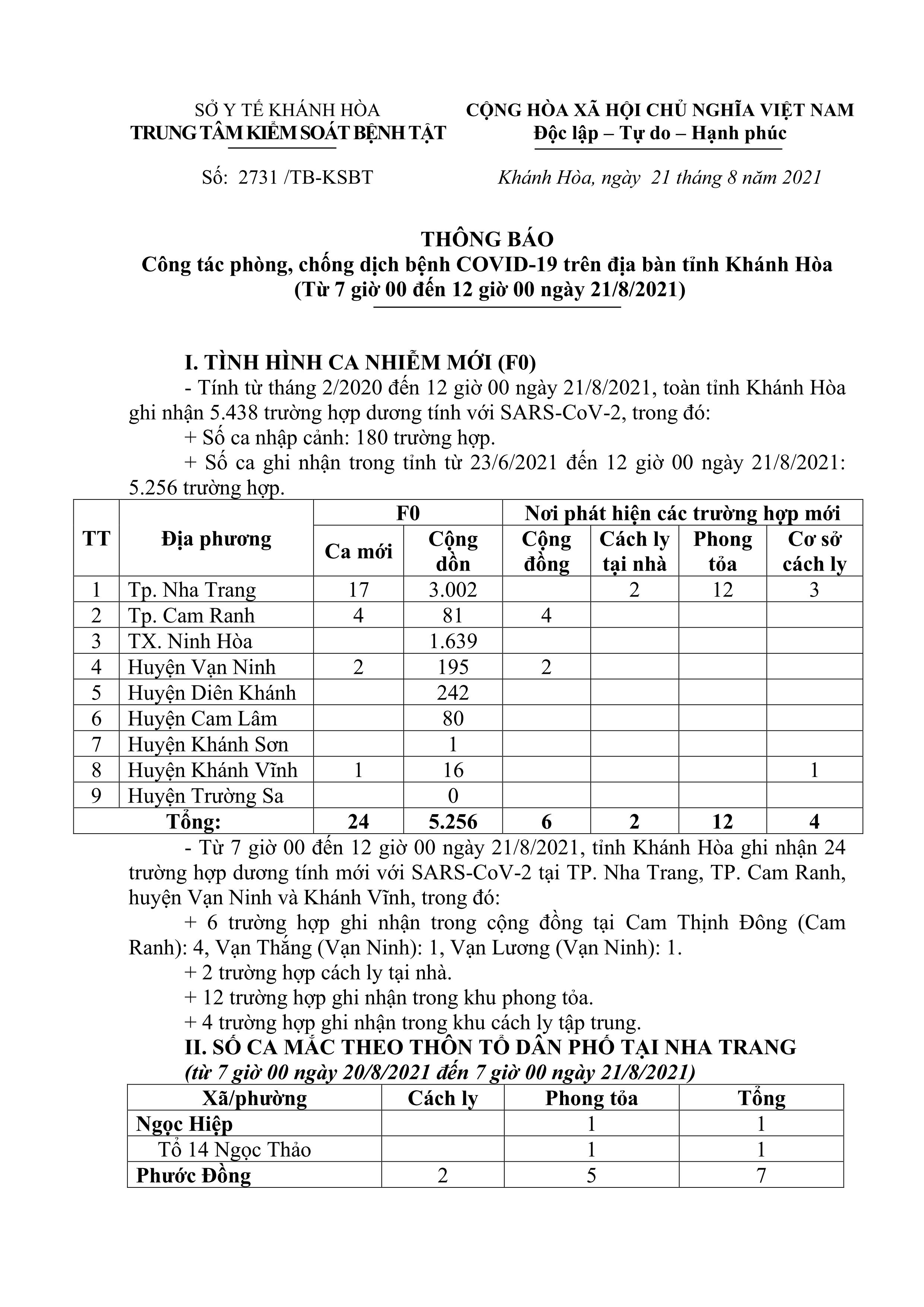 Trưa 21-8, theo Trung tâm Kiểm soát bệnh tật tỉnh Khánh Hòa, từ 7 giờ đến 12 giờ ngày 21-8, toàn tỉnh ghi nhận thêm 24 ca dương tính với SARS-CoV-2.