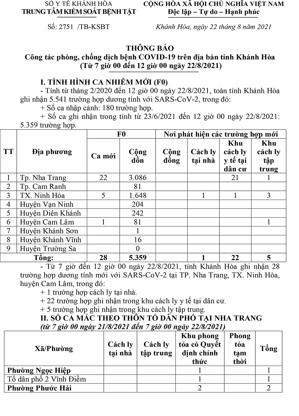 Trưa 22-8, theo Trung tâm Kiểm soát bệnh tật tỉnh Khánh Hòa, từ 7 giờ đến 12 giờ cùng ngày, toàn tỉnh ghi nhận thêm 28 ca dương tính với SARS-CoV-2.