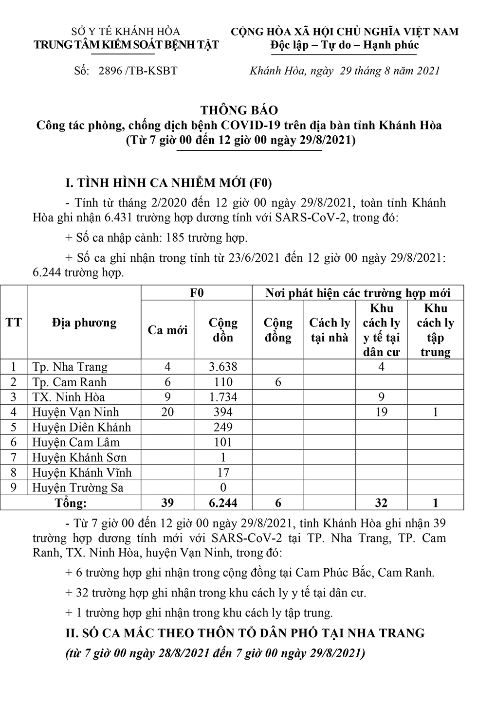 Trưa 29-8, theo Trung tâm Kiểm soát bệnh tật tỉnh Khánh Hòa, từ 7 giờ đến 12 giờ cùng ngày, toàn tỉnh ghi nhận thêm 39 ca dương tính với SARS-CoV-2.
