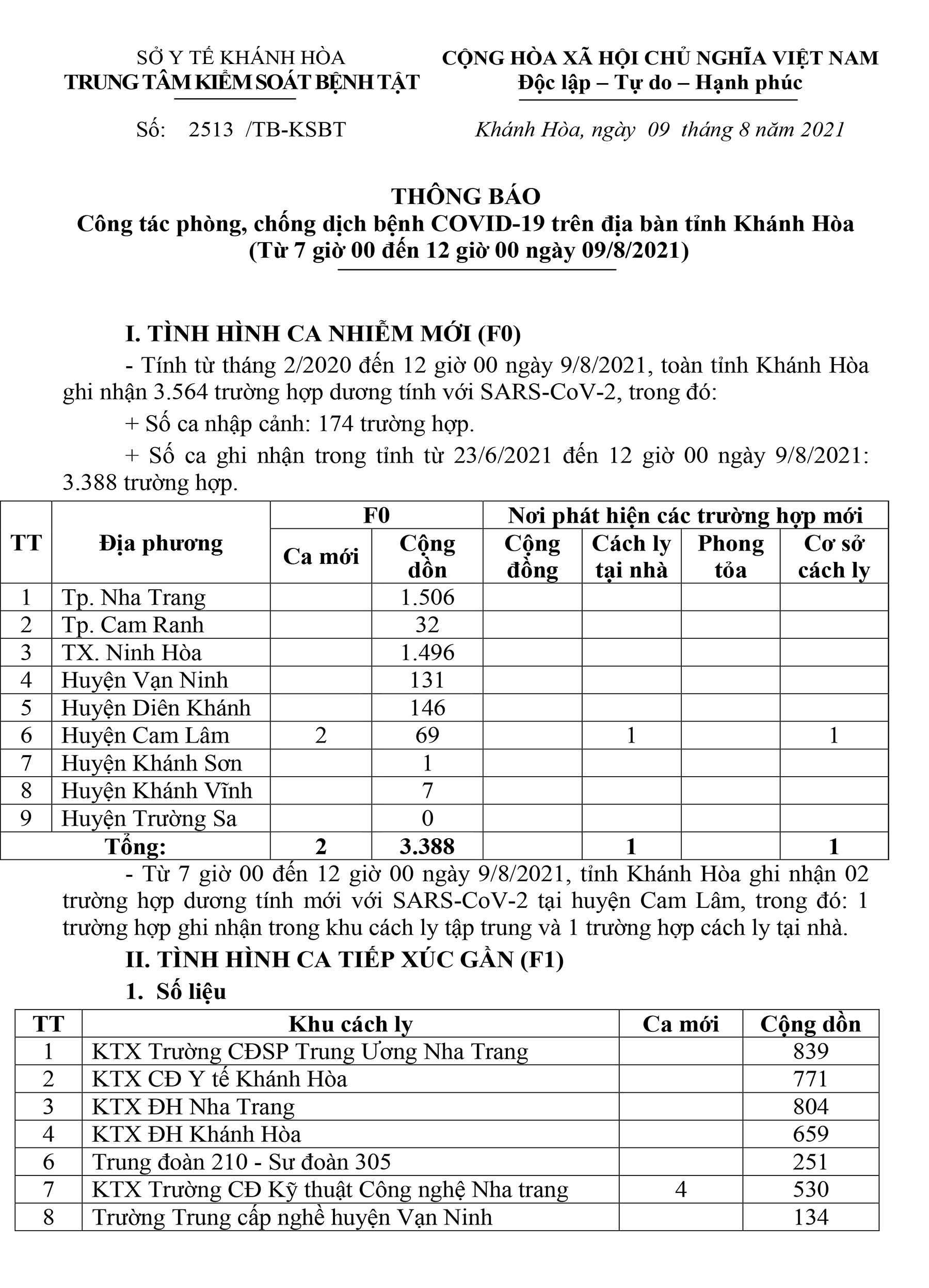 Trưa 9-8, theo Trung tâm Kiểm soát bệnh tật tỉnh Khánh Hòa, từ 7 giờ đến 12 giờ cùng ngày, toàn tỉnh ghi nhận thêm 2 ca dương tính với SARS-CoV-2.