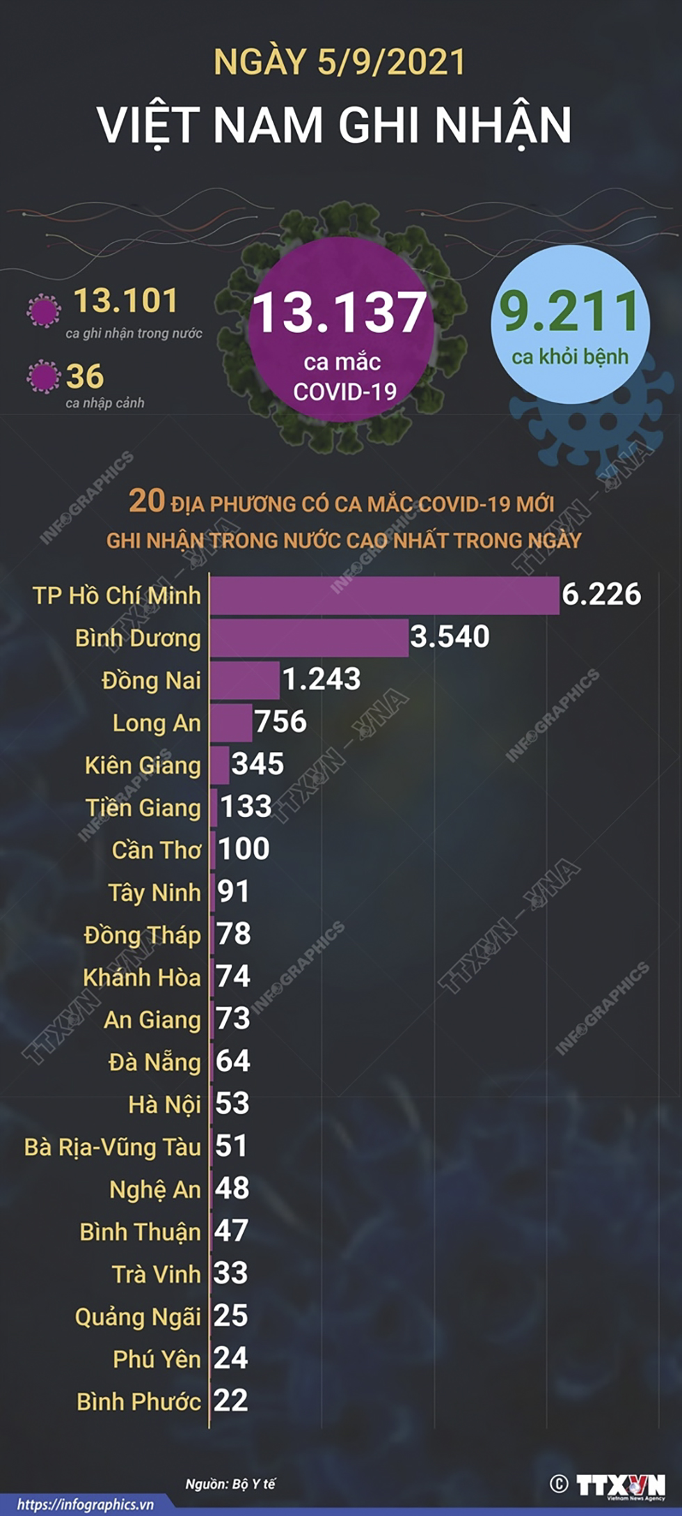 Tính từ 17h ngày 4/9 đến 17h ngày 5/9/2021, Việt Nam ghi nhận 13.137 ca mắc COVID-19 mới, trong đó 36 ca nhập cảnh và 13.101 ca trong nước. TP Hồ Chí Minh ghi nhận 6.226 ca, Bình Dương 3.540 ca, Đồng Nai 1.243 ca, Long An 756 ca, Kiên Giang 345 ca, Tiền Giang 133 ca, Cần Thơ 100 ca, Tây Ninh 91 ca, Đồng Tháp 78 ca, Khánh Hòa 74 ca, An Giang 73 ca, Đà Nẵng 64 ca, Hà Nội 53 ca, Bà Rịa-Vũng Tàu 51 ca, Nghệ An 48 ca, Bình Thuận 47 ca, Trà Vinh 33 ca, Quảng Ngãi 25 ca, Phú Yên 24 ca, Bình Phước 22 ca, Vĩnh Long 20 ca..., trong đó có 7.521 ca trong cộng đồng. 9.211 ca được công bố khỏi bệnh.