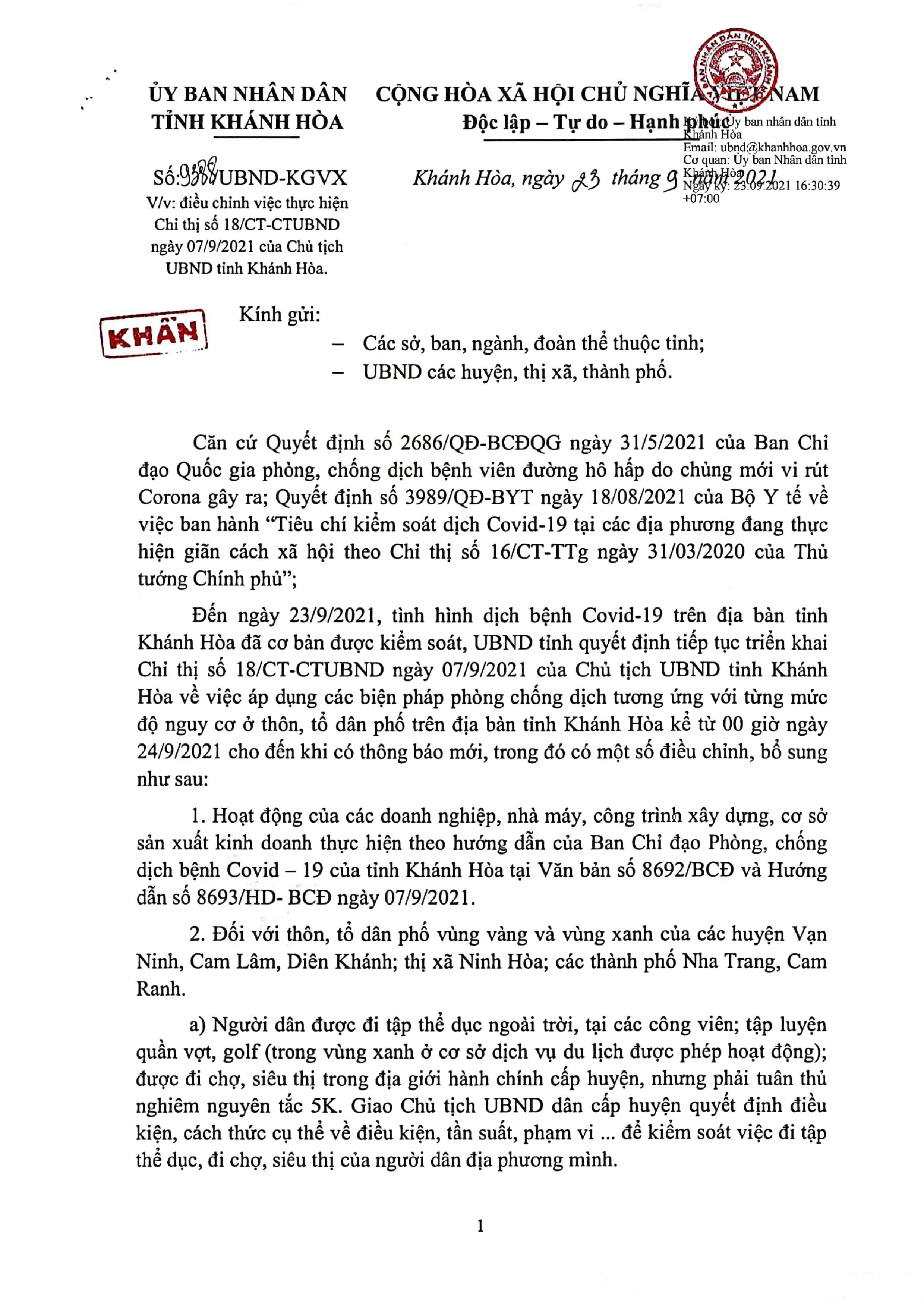 Ngày 23-9, UBND tỉnh Khánh Hòa có công văn khẩn về việc điều chỉnh việc thực hiện các biện pháp phòng, chống dịch Covid-19. Theo đó, UBND tỉnh Khánh Hòa quyết định tiếp tục triển khai Chỉ thị số 18/CT-CTUBND ngày 7-9-2021 của Chủ tịch UBND tỉnh Khánh Hòa về việc áp dụng các biện pháp phòng, chống dịch tương ứng với từng mức độ nguy cơ ở thôn, tổ dân phố trên địa bàn tỉnh kể từ 0 giờ ngày 24-9-2021 cho đến khi có thông báo mới, trong đó có một số điều chỉnh, bổ sung.