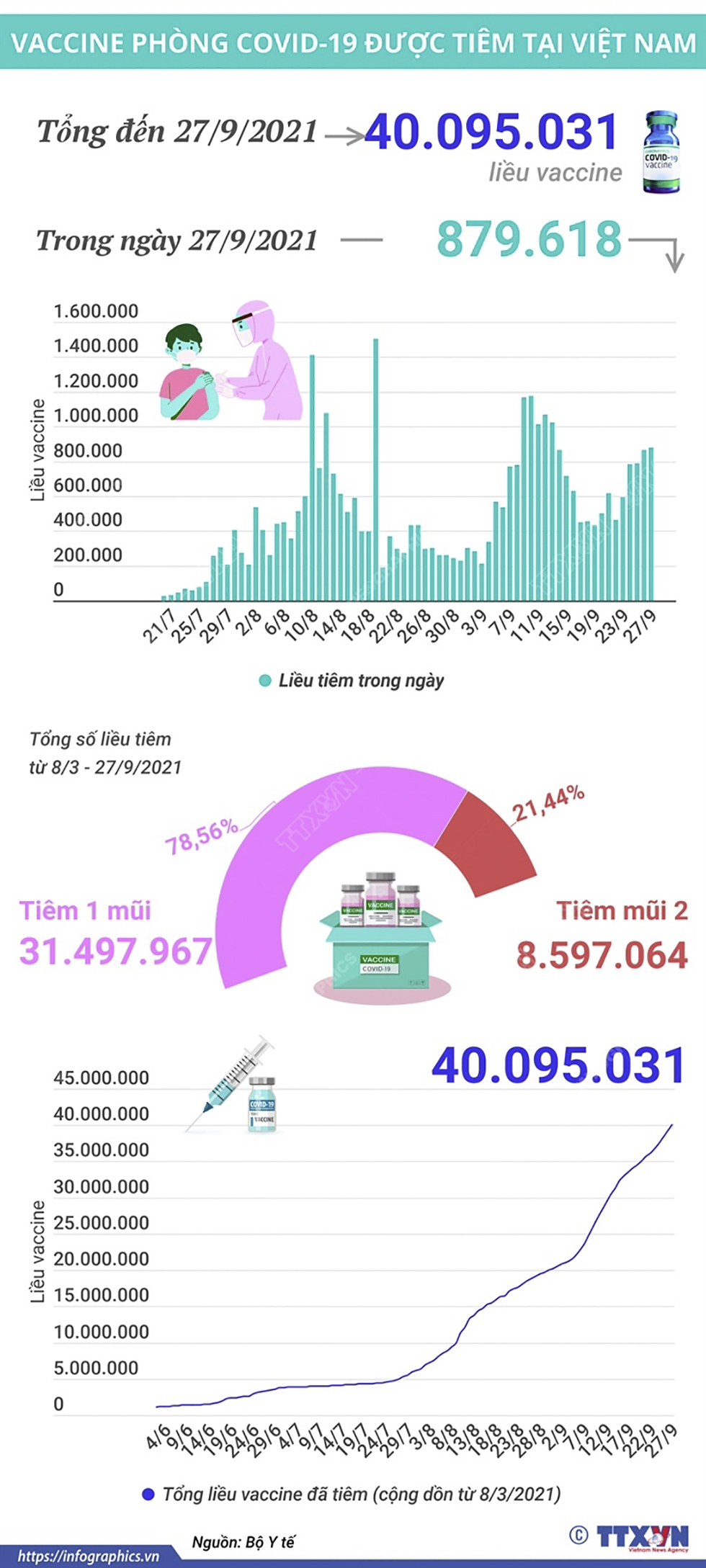 Trong ngày 27/9/2021 có 879.618 liều vaccine phòng COVID-19 được tiêm. Như vậy, tổng số liều vaccine đã được tiêm tại Việt Nam là 40.095.031 liều, trong đó tiêm 1 mũi là 31.497.967 liều, tiêm mũi 2 là 8.597.064.