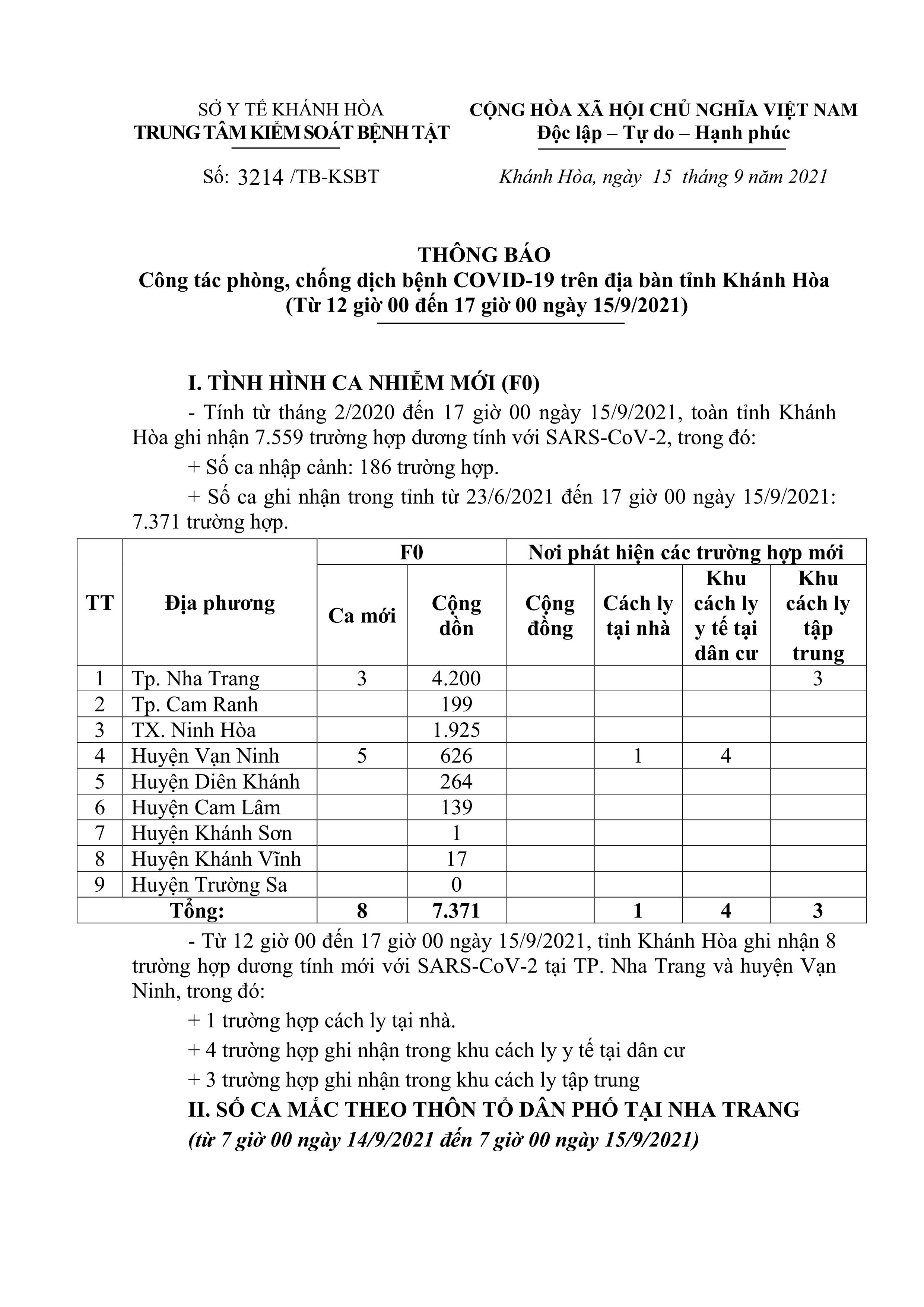 Chiều 15-9, theo Trung tâm Kiểm soát bệnh tật tỉnh Khánh Hòa, từ 12 giờ đến 17 giờ ngày 15-9, toàn tỉnh ghi nhận thêm 8 ca dương tính với SARS-CoV-2.