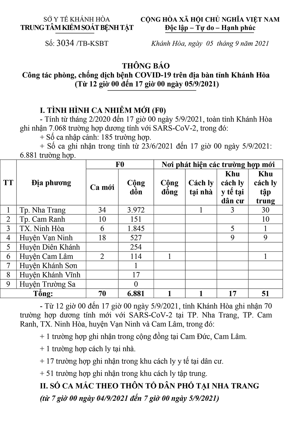 Chiều 5-9, theo Trung tâm Kiểm soát bệnh tật tỉnh Khánh Hòa, từ 12 giờ đến 17 giờ cùng ngày, toàn tỉnh ghi nhận thêm 70 ca dương tính với SARS-CoV-2.