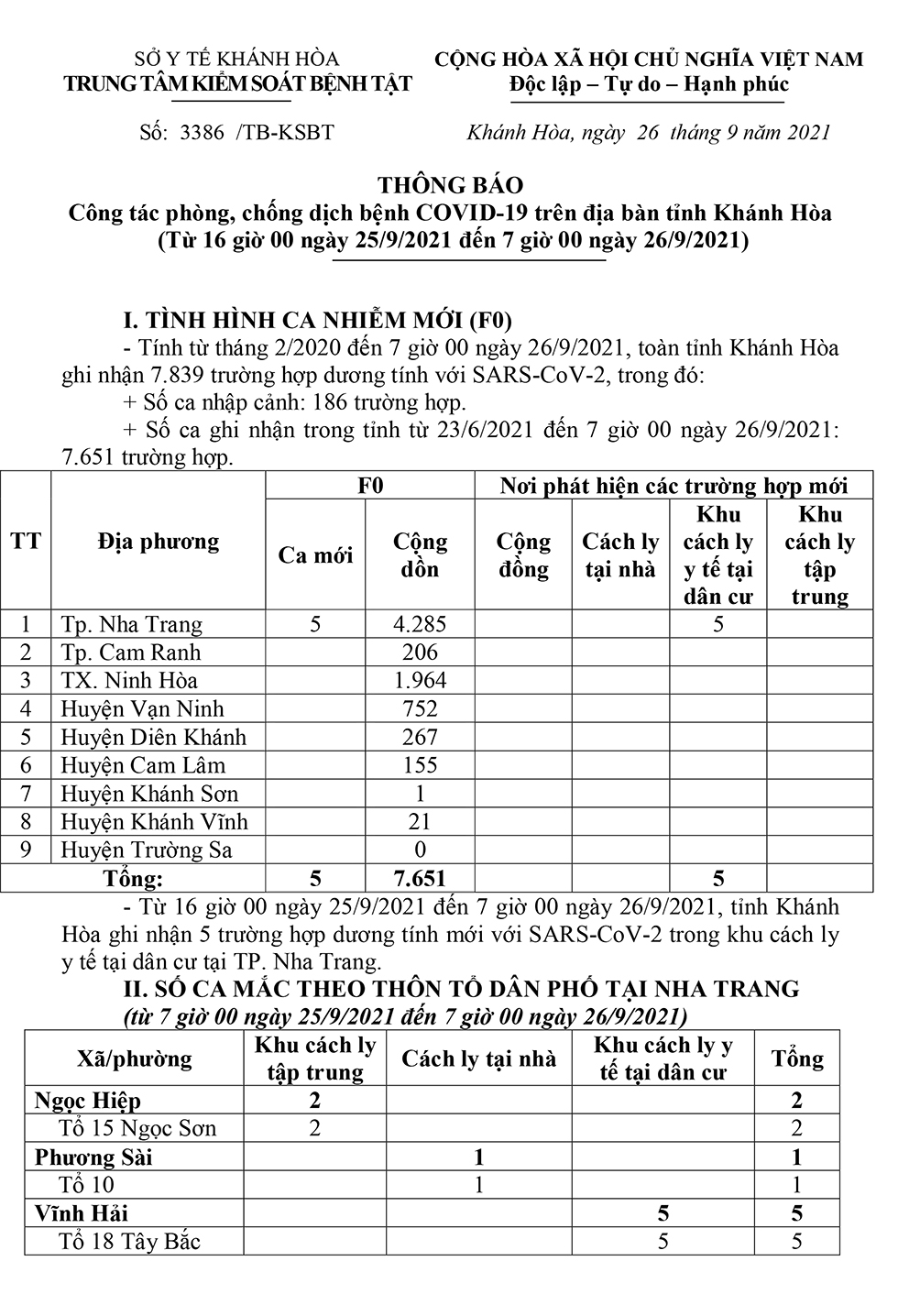 Sáng 26-9, theo Trung tâm Kiểm soát bệnh tật tỉnh Khánh Hòa, từ 16 giờ ngày 25-9 đến 7 giờ ngày 26-9, toàn tỉnh ghi nhận thêm 5 ca dương tính với SARS-CoV-2.