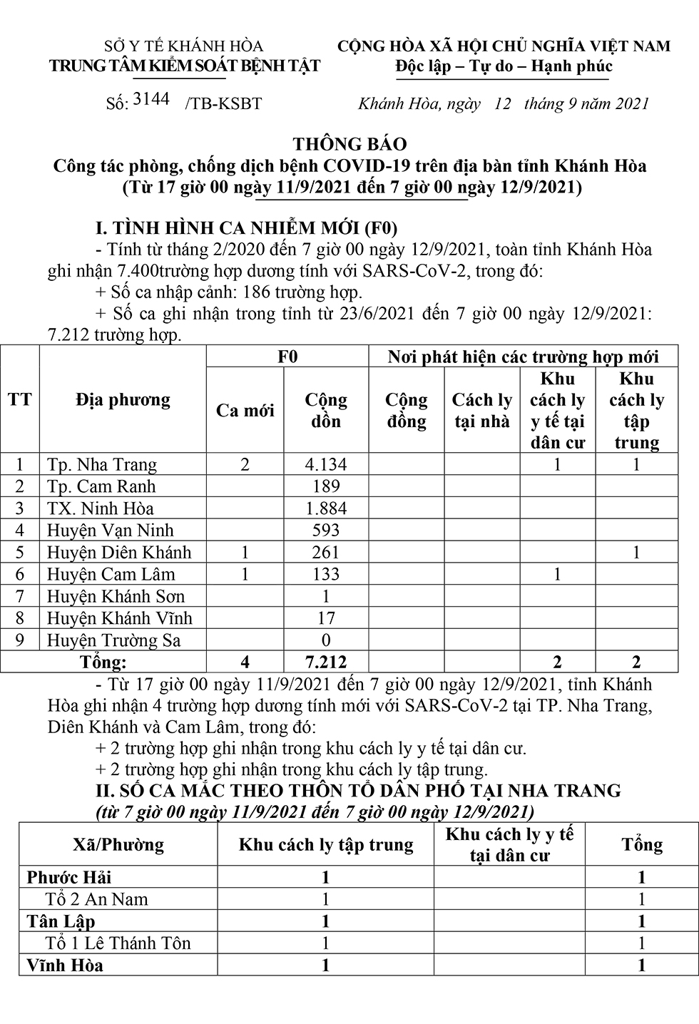 Sáng 12-9, theo Trung tâm Kiểm soát bệnh tật tỉnh Khánh Hòa, từ 17 giờ ngày 11-9 đến 7 giờ ngày 12-9, toàn tỉnh ghi nhận thêm 4 ca dương tính với SARS-CoV-2.