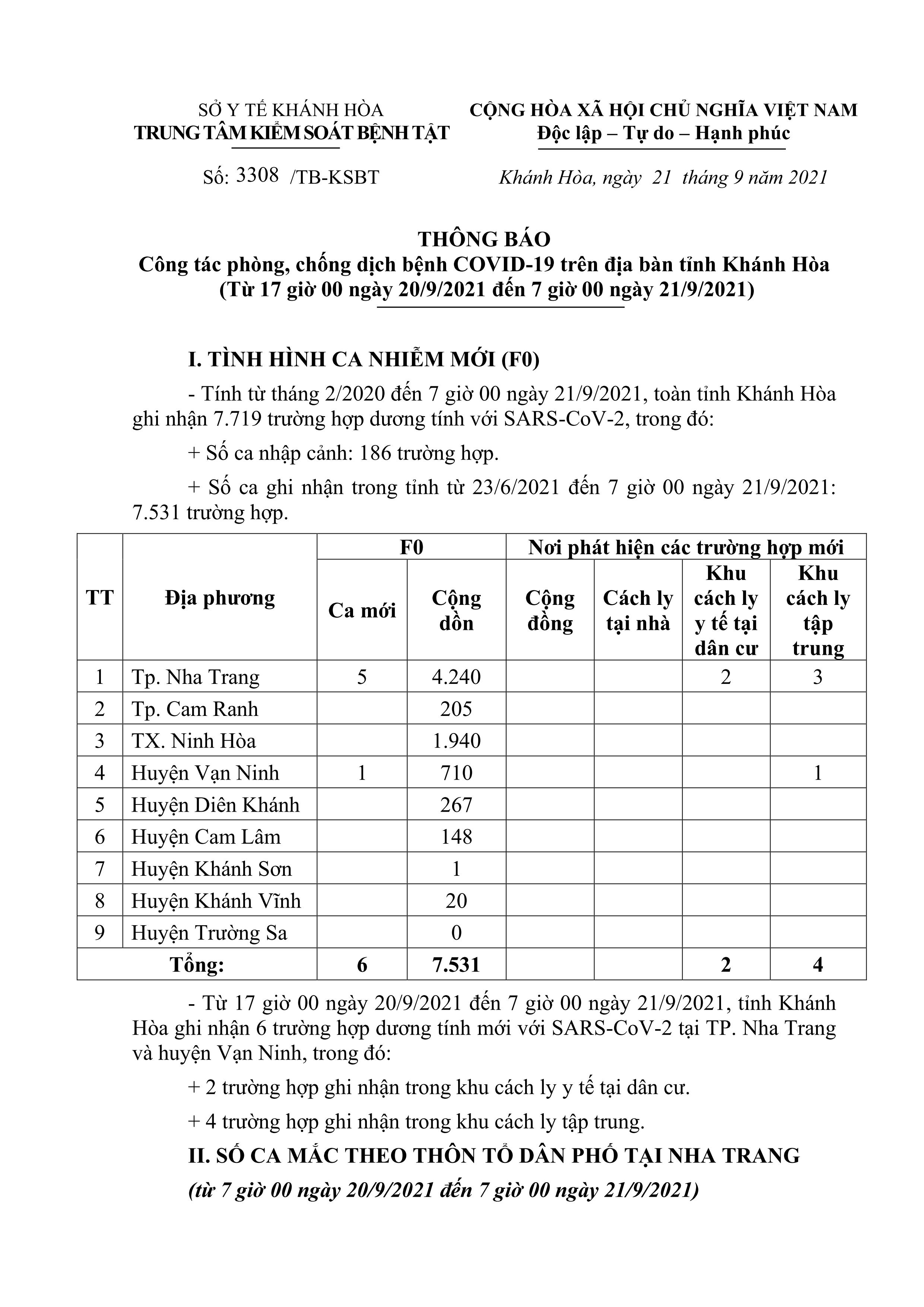 Sáng 21-9, theo Trung tâm Kiểm soát bệnh tật tỉnh Khánh Hòa, từ 17 giờ ngày 20-9 đến 7 giờ ngày 21-9, toàn tỉnh ghi nhận thêm 6 ca dương tính với SARS-CoV-2.