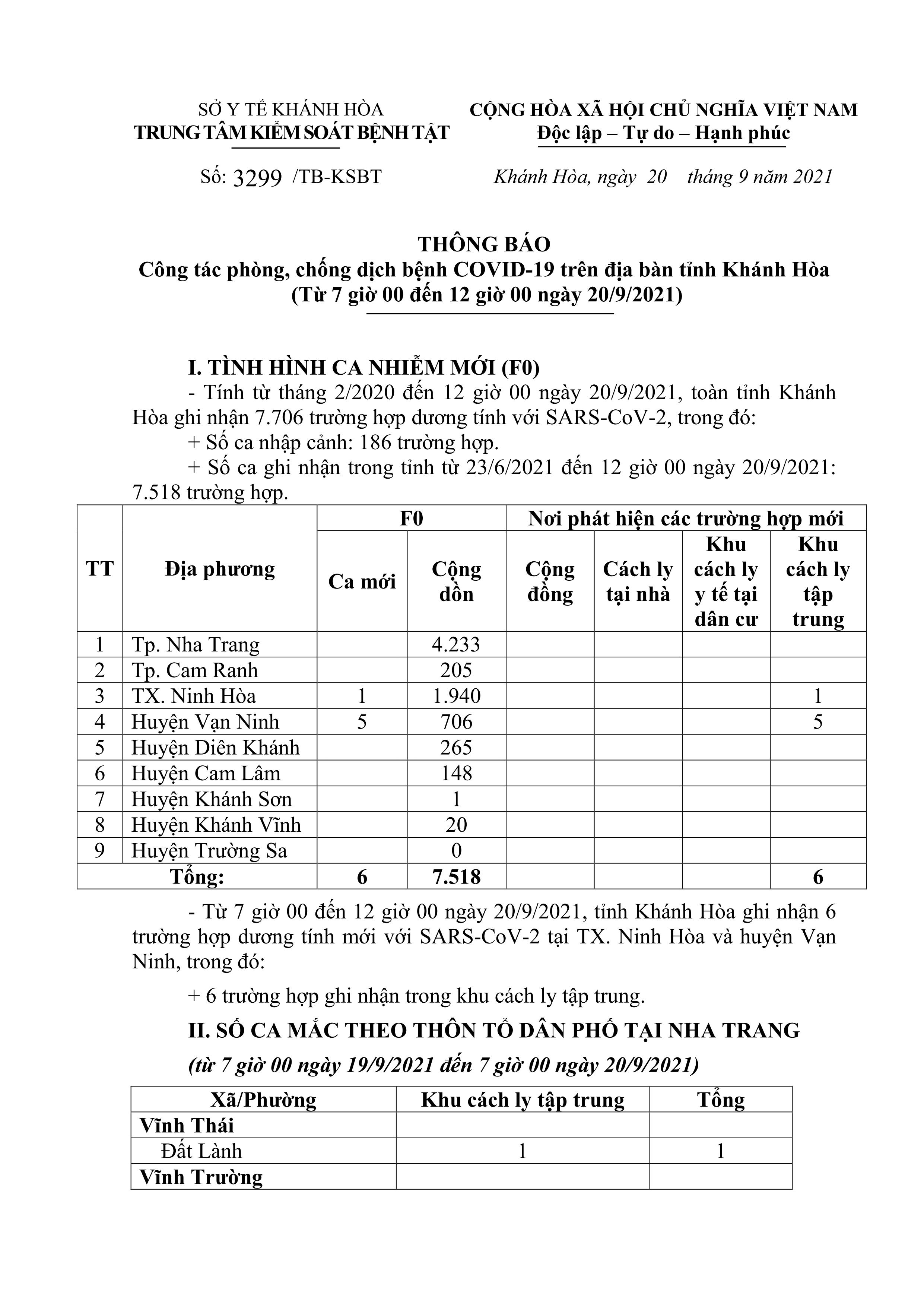 Trưa 20-9, theo Trung tâm Kiểm soát bệnh tật tỉnh Khánh Hòa, từ 7 giờ đến 12 giờ ngày 20-9, toàn tỉnh ghi nhận thêm 6 ca dương tính với SARS-CoV-2.