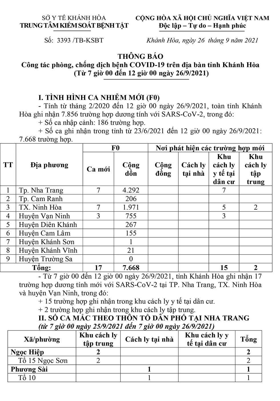 Trưa 26-9, theo Trung tâm Kiểm soát bệnh tật tỉnh Khánh Hòa, từ 7 giờ đến 12 giờ cùng ngày, toàn tỉnh ghi nhận thêm 17 ca dương tính với SARS-CoV-2.