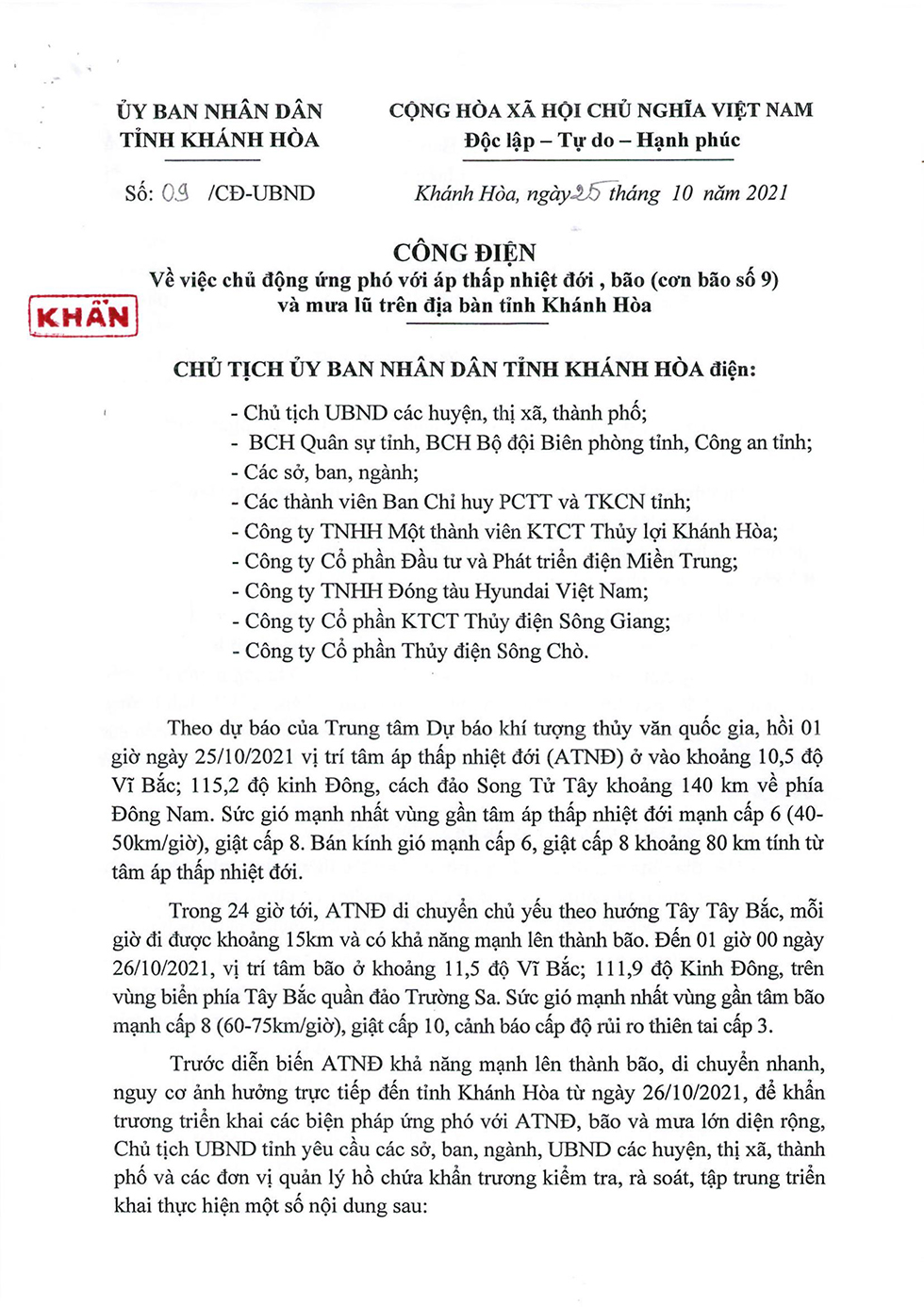 Ngày 25-10, UBND tỉnh Khánh Hòa có Công điện khẩn về việc chủ động ứng phó với áp thấp nhiệt đới, bão (cơn bão số 9) và mưa lũ trên địa bàn tỉnh Khánh Hòa.