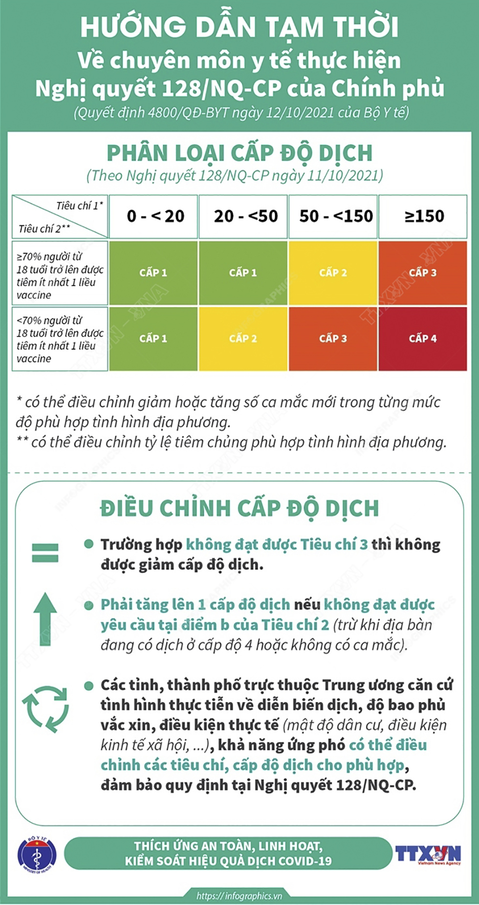 Theo Hướng dẫn tạm thời về chuyên môn y tế thực hiện Nghị quyết số 128/NQ-CP của Chính phủ, có 4 cấp độ dịch tương ứng với các màu xanh, vàng, cam và đỏ.
