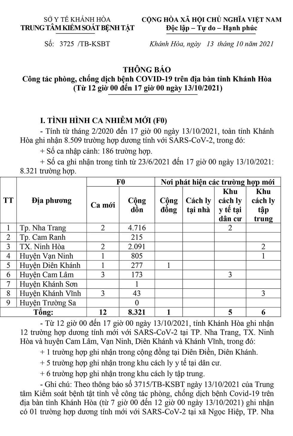 Chiều 13-10, theo Trung tâm Kiểm soát bệnh tật tỉnh Khánh Hòa, từ 12 giờ đến 17 giờ cùng ngày, toàn tỉnh ghi nhận thêm 12 ca dương tính với SARS-CoV-2.