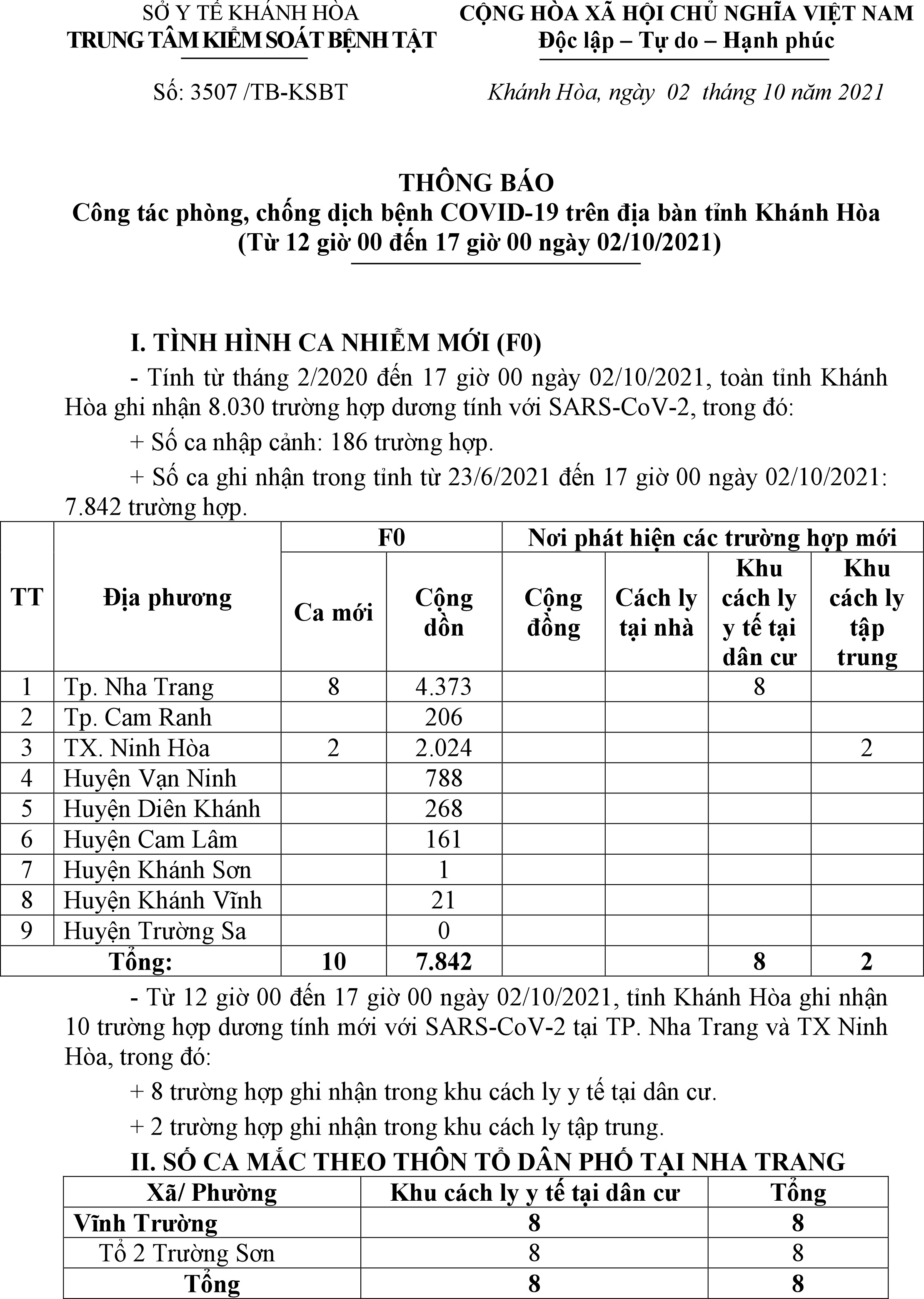 Chiều 2-10, theo Trung tâm Kiểm soát bệnh tật tỉnh Khánh Hòa, từ 12 giờ đến 17 giờ ngày 2-10, toàn tỉnh ghi nhận thêm 10 ca dương tính với SARS-CoV-2.