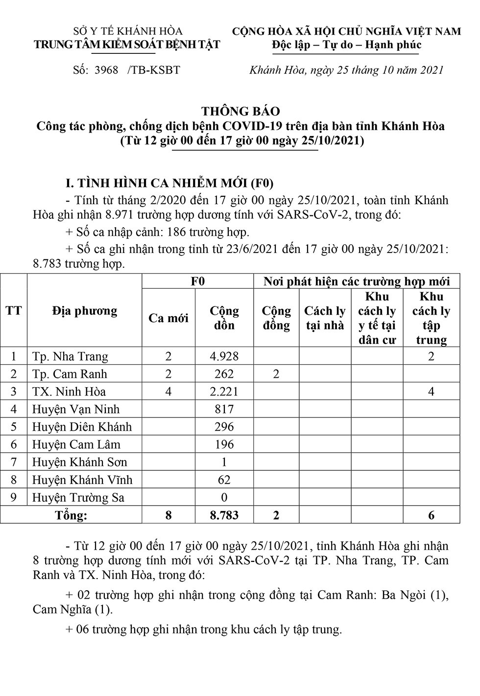 Chiều 25-10, theo Trung tâm Kiểm soát bệnh tật tỉnh Khánh Hòa, từ 12 giờ đến 17 giờ cùng ngày, toàn tỉnh ghi nhận thêm 8 ca dương tính với SARS-CoV-2.
