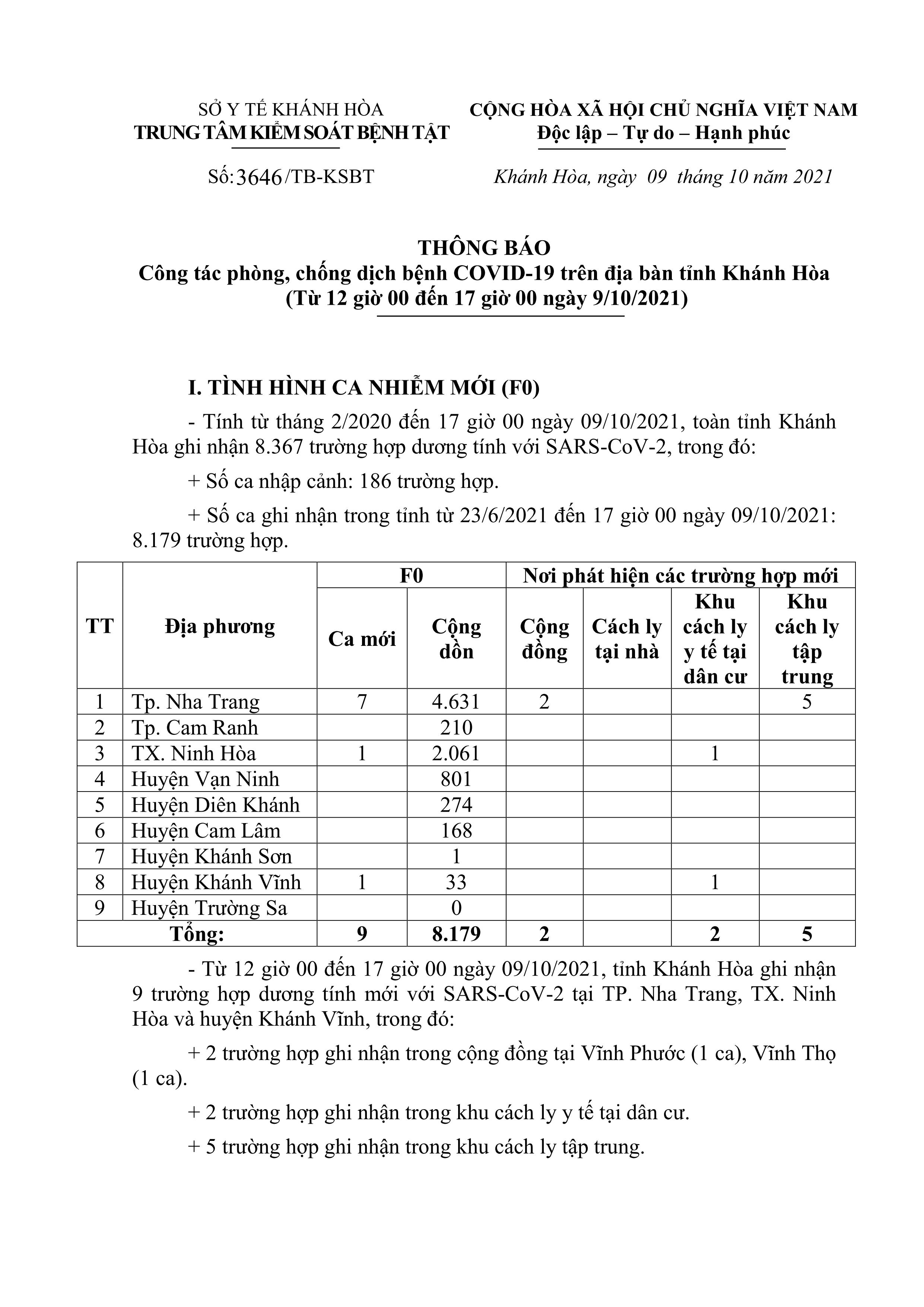 Chiều 9-10, theo Trung tâm Kiểm soát bệnh tật tỉnh Khánh Hòa, từ 12 giờ đến 17 giờ ngày 9-10, toàn tỉnh ghi nhận thêm 9 ca dương tính với SARS-CoV-2.