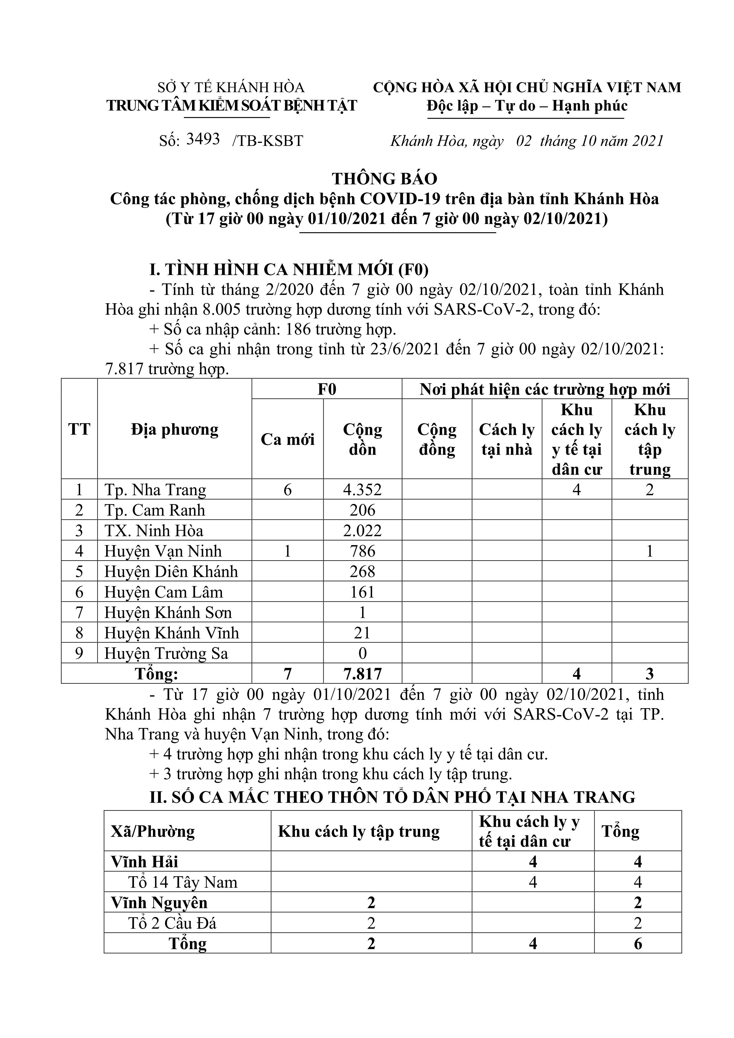Sáng 2-10, theo Trung tâm Kiểm soát bệnh tật tỉnh Khánh Hòa, từ 17 giờ ngày 1-10 đến 7 giờ ngày 2-10, toàn tỉnh ghi nhận thêm 7 ca dương tính với SARS-CoV-2.