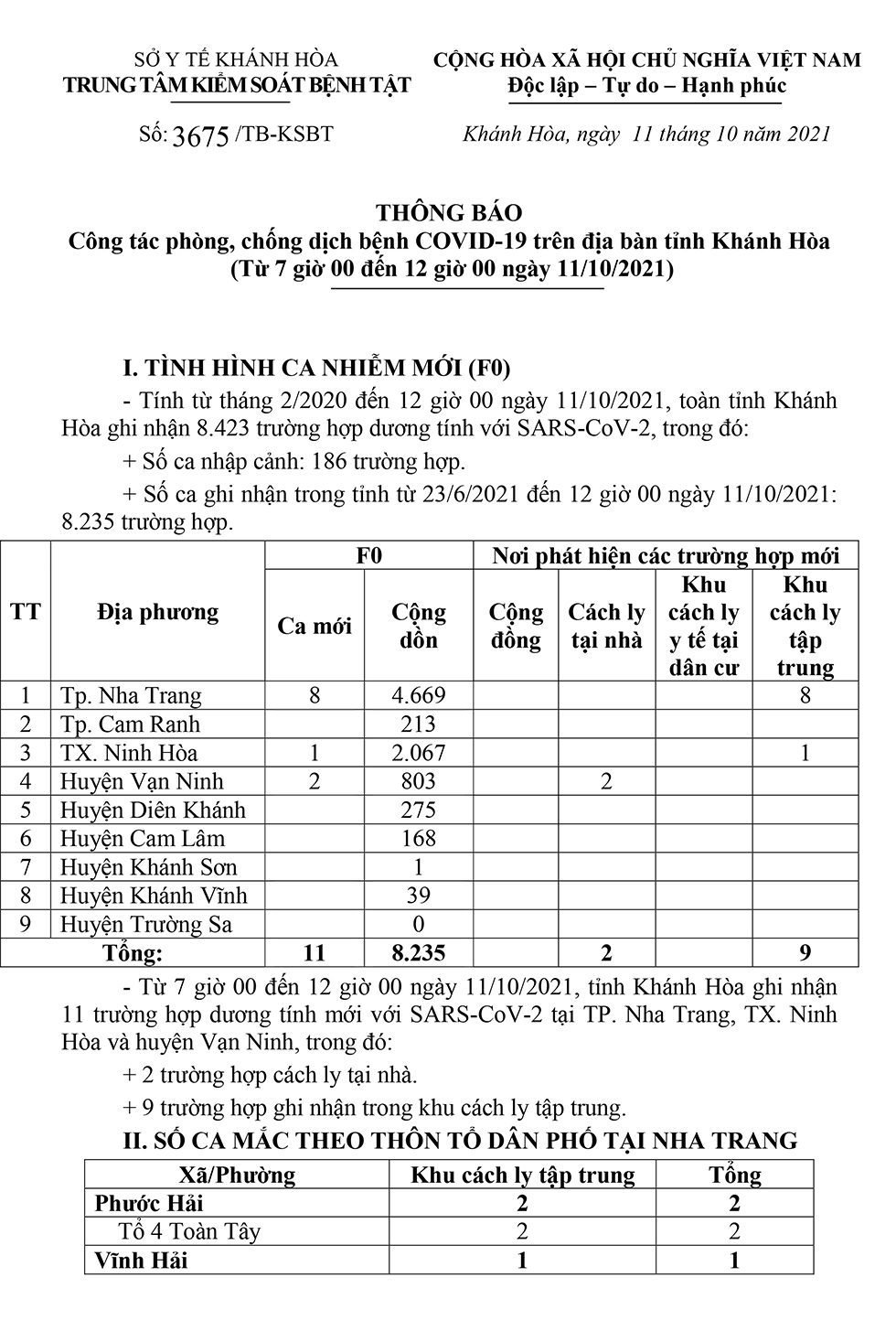 Trưa 11-10, theo Trung tâm Kiểm soát bệnh tật tỉnh Khánh Hòa, từ 7 giờ đến 12 giờ cùng ngày, toàn tỉnh ghi nhận thêm 11 ca dương tính với SARS-CoV-2.