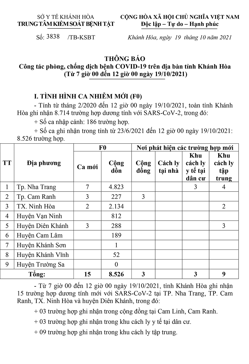 Trưa 19-10, theo Trung tâm Kiểm soát bệnh tật tỉnh Khánh Hòa, từ 7 giờ đến 12 giờ cùng ngày, toàn tỉnh ghi nhận thêm 15 ca dương tính với SARS-CoV-2.