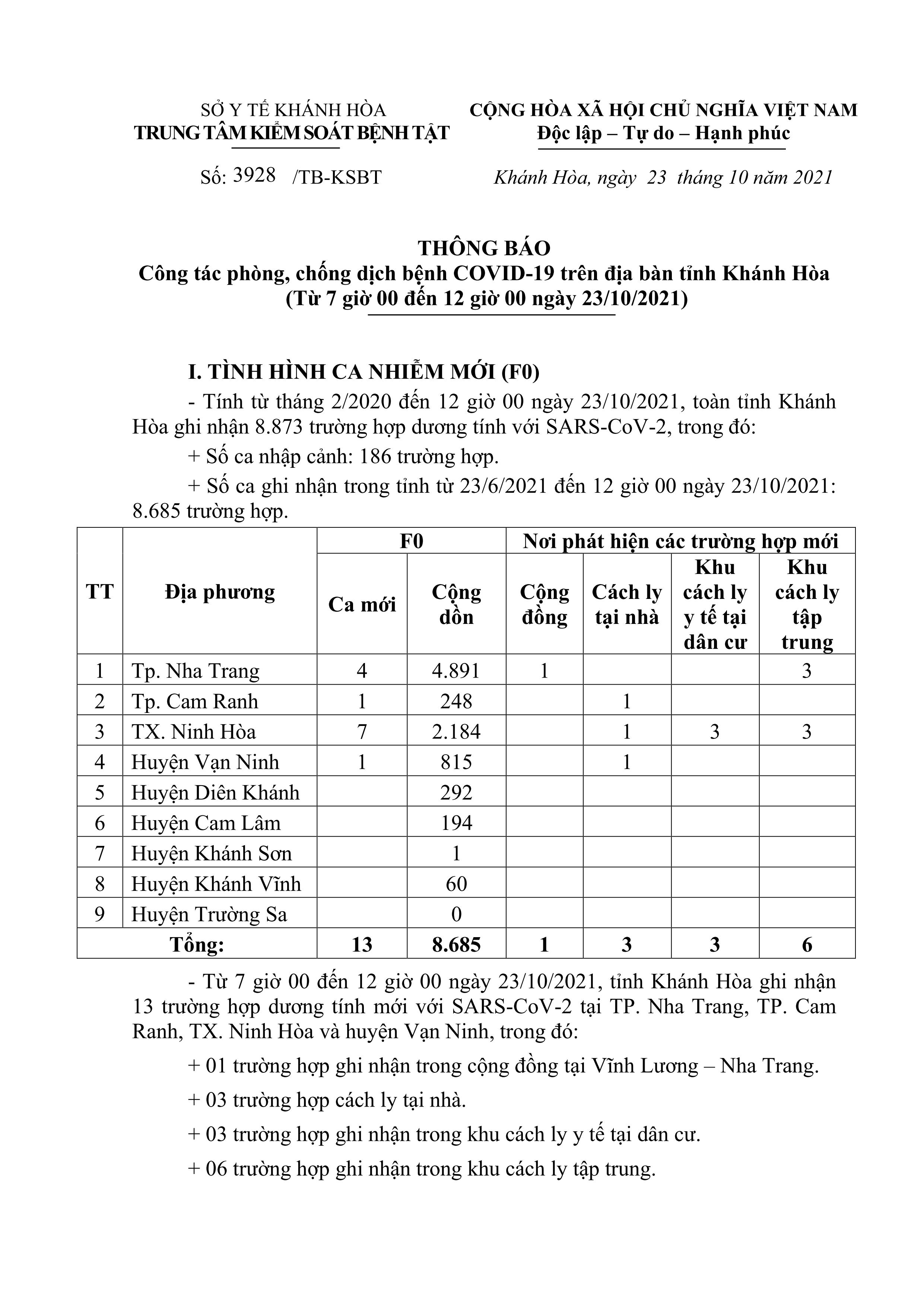 Trưa 23-10, theo Trung tâm Kiểm soát bệnh tật tỉnh Khánh Hòa, từ 7 giờ đến 12 giờ ngày 23-10, toàn tỉnh ghi nhận thêm 13 ca dương tính với SARS-CoV-2.