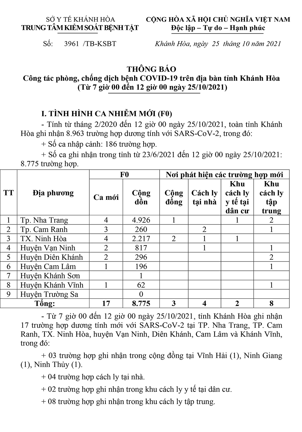 Trưa 25-10, theo Trung tâm Kiểm soát bệnh tật tỉnh Khánh Hòa, từ 7 giờ đến 12 giờ cùng ngày, toàn tỉnh ghi nhận thêm 17 ca dương tính với SARS-CoV-2.