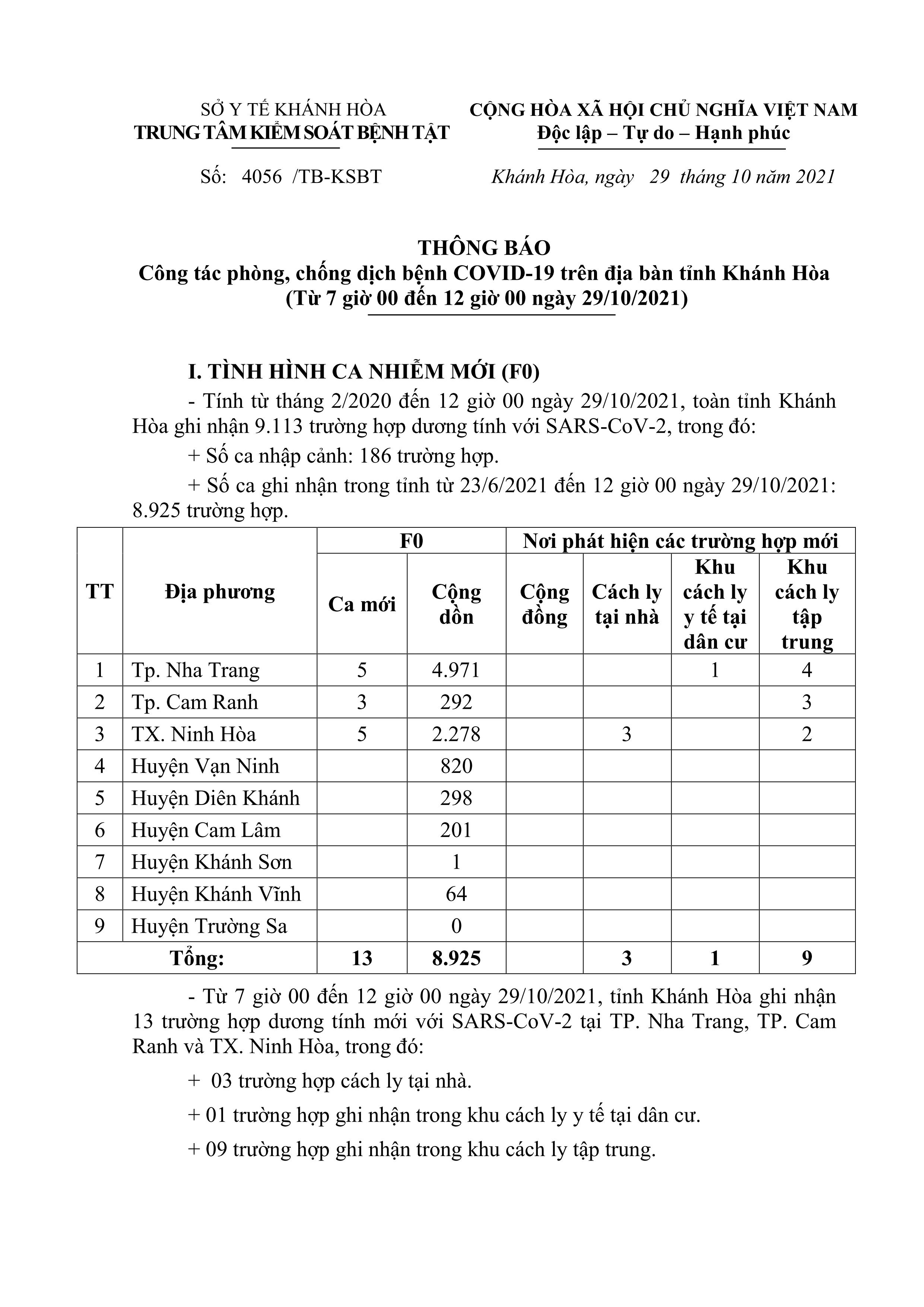 Trưa 29-10, theo Trung tâm Kiểm soát bệnh tật tỉnh Khánh Hòa, từ 7 giờ đến 12 giờ ngày 29-10, toàn tỉnh ghi nhận thêm 13 ca dương tính với SARS-CoV-2.