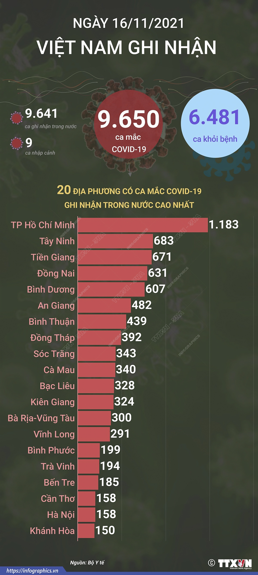 Tính từ 16h ngày 15/11 đến 16h ngày 16/11/2021, Việt Nam ghi nhận 9.650 ca mắc mới COVID-19, trong đó 9 ca nhập cảnh và 9.641 ca trong nước tại 59 tỉnh, thành phố. TP Hồ Chí Minh ghi nhận 1.183 ca, Tây Ninh 683 ca, Tiền Giang 671 ca, Đồng Nai 631 ca...