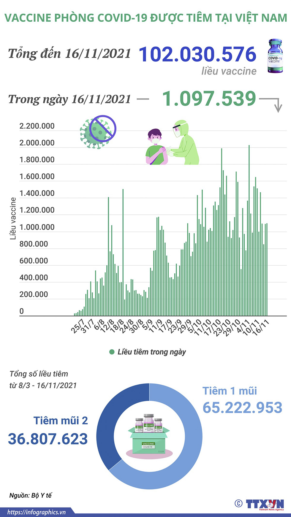 Trong ngày 16/11/2021 có 1.097.539 liều vaccine phòng COVID-19 được tiêm. Như vậy, tổng số liều vaccine đã được tiêm tại Việt Nam là 102.030.576 liều, trong đó tiêm 1 mũi là 65.222.953 liều, tiêm mũi 2 là 36.807.623.