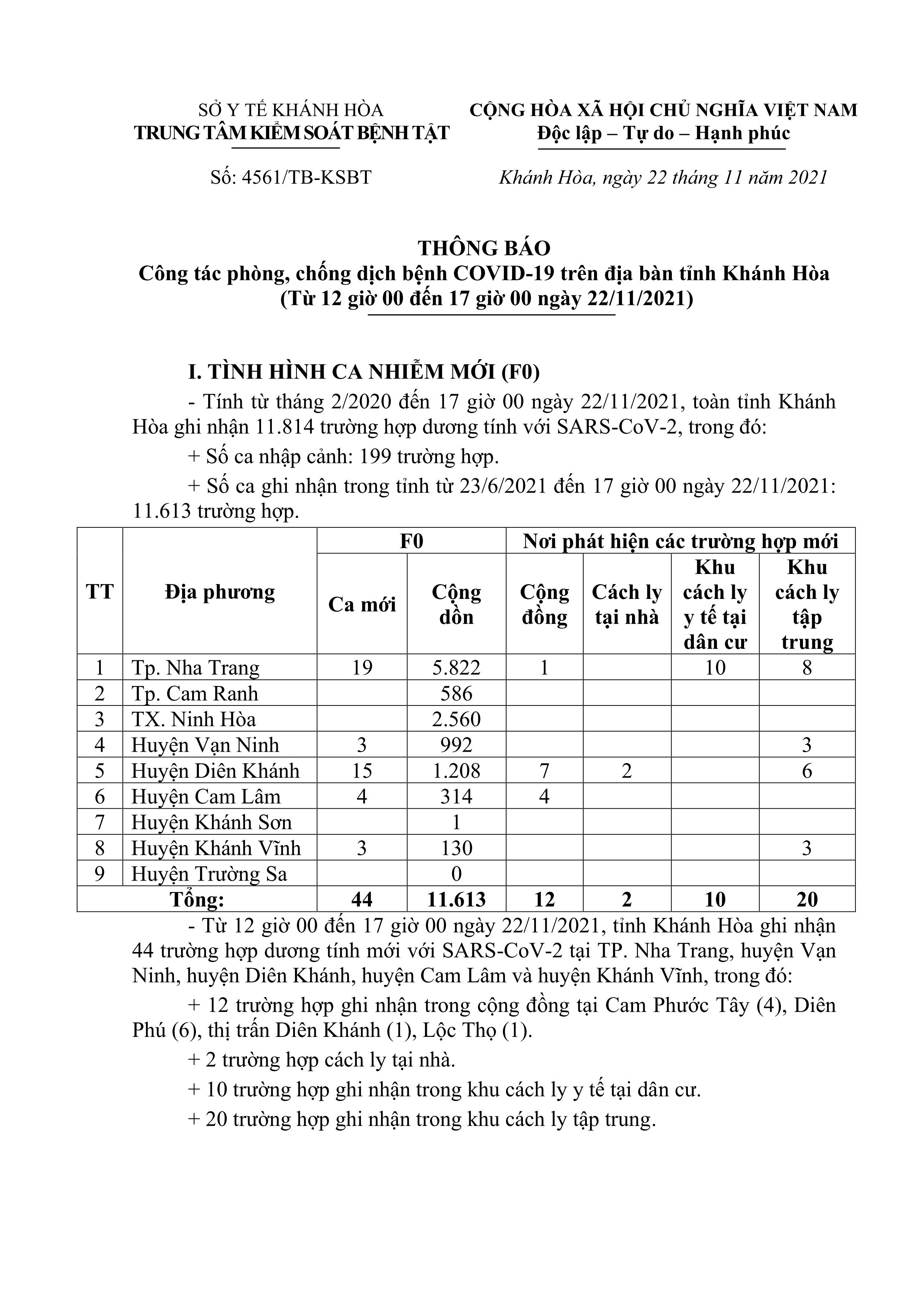 Chiều 22-11, theo Trung tâm Kiểm soát bệnh tật tỉnh Khánh Hòa, từ 12 giờ đến 17 giờ ngày 22-11, toàn tỉnh ghi nhận thêm 49 ca dương tính với SARS-CoV-2.