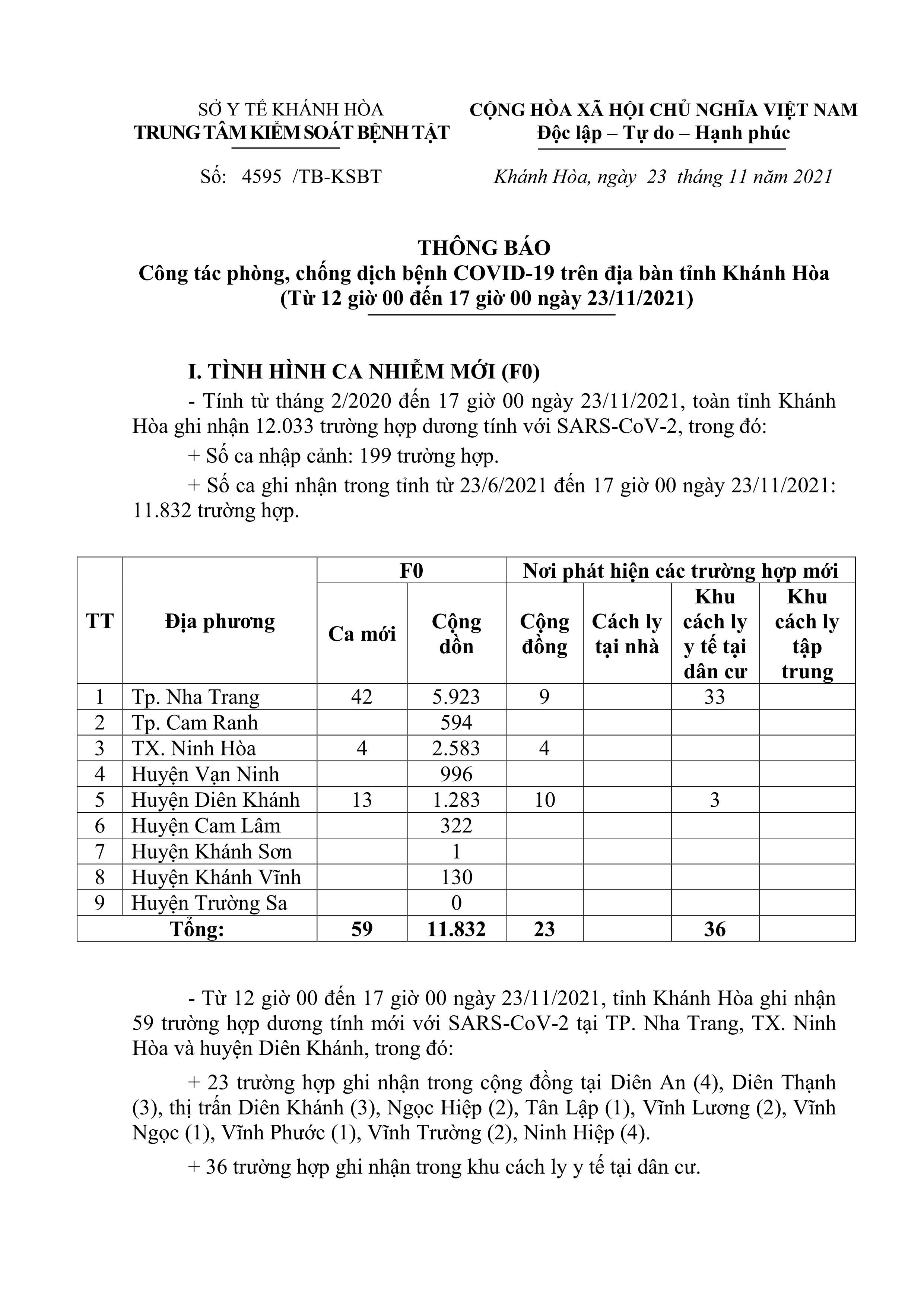 Chiều 23-11, theo Trung tâm Kiểm soát bệnh tật tỉnh Khánh Hòa, từ 12 giờ đến 17 giờ ngày 23-11, toàn tỉnh ghi nhận thêm 59 ca dương tính với SARS-CoV-2.