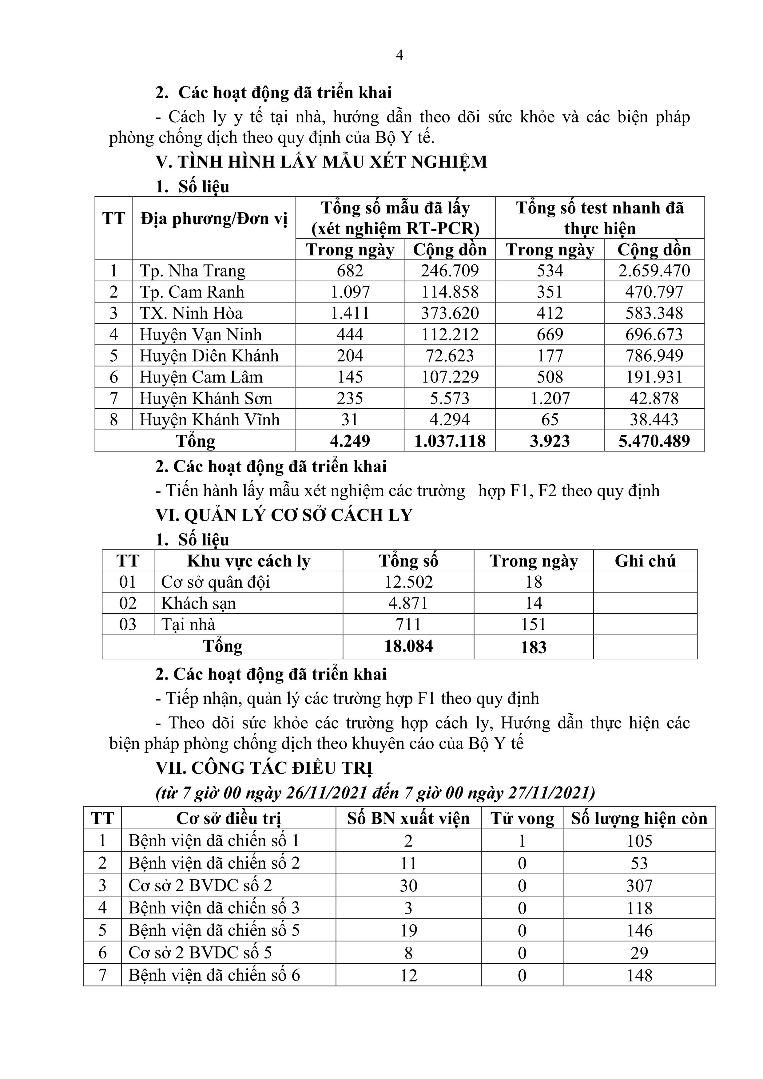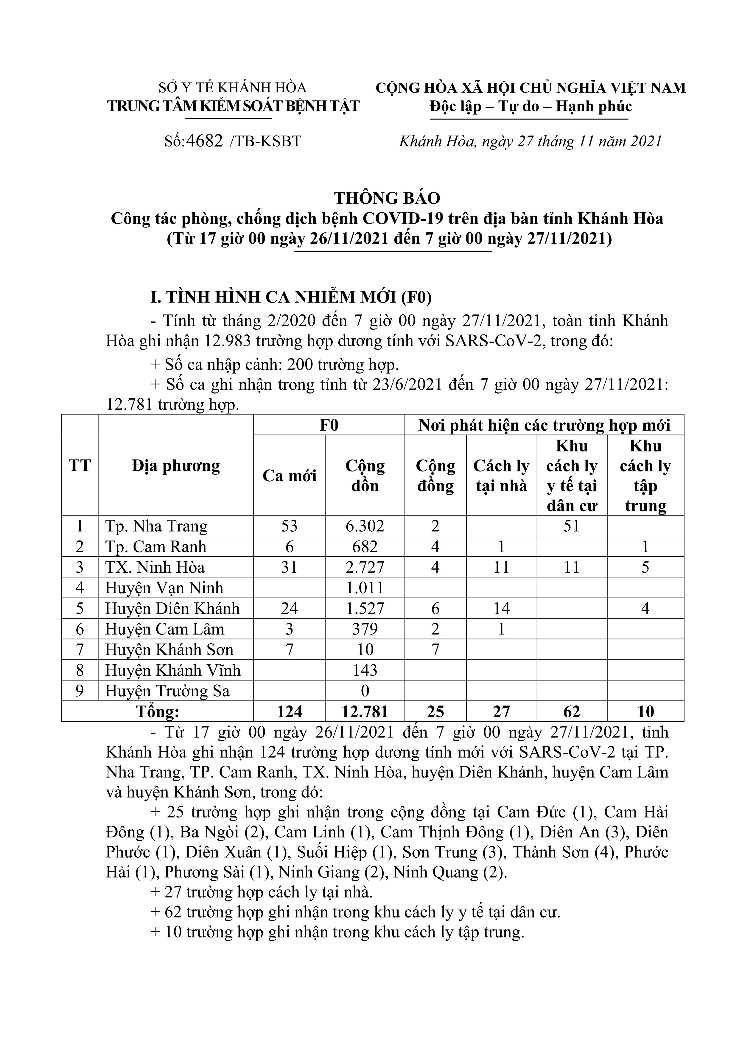 Sáng 27-11, theo Trung tâm Kiểm soát bệnh tật tỉnh Khánh Hòa, từ 17 giờ ngày 26-11 đến 7 giờ ngày 27-11, toàn tỉnh ghi nhận thêm 124 ca dương tính với SARS-CoV-2.