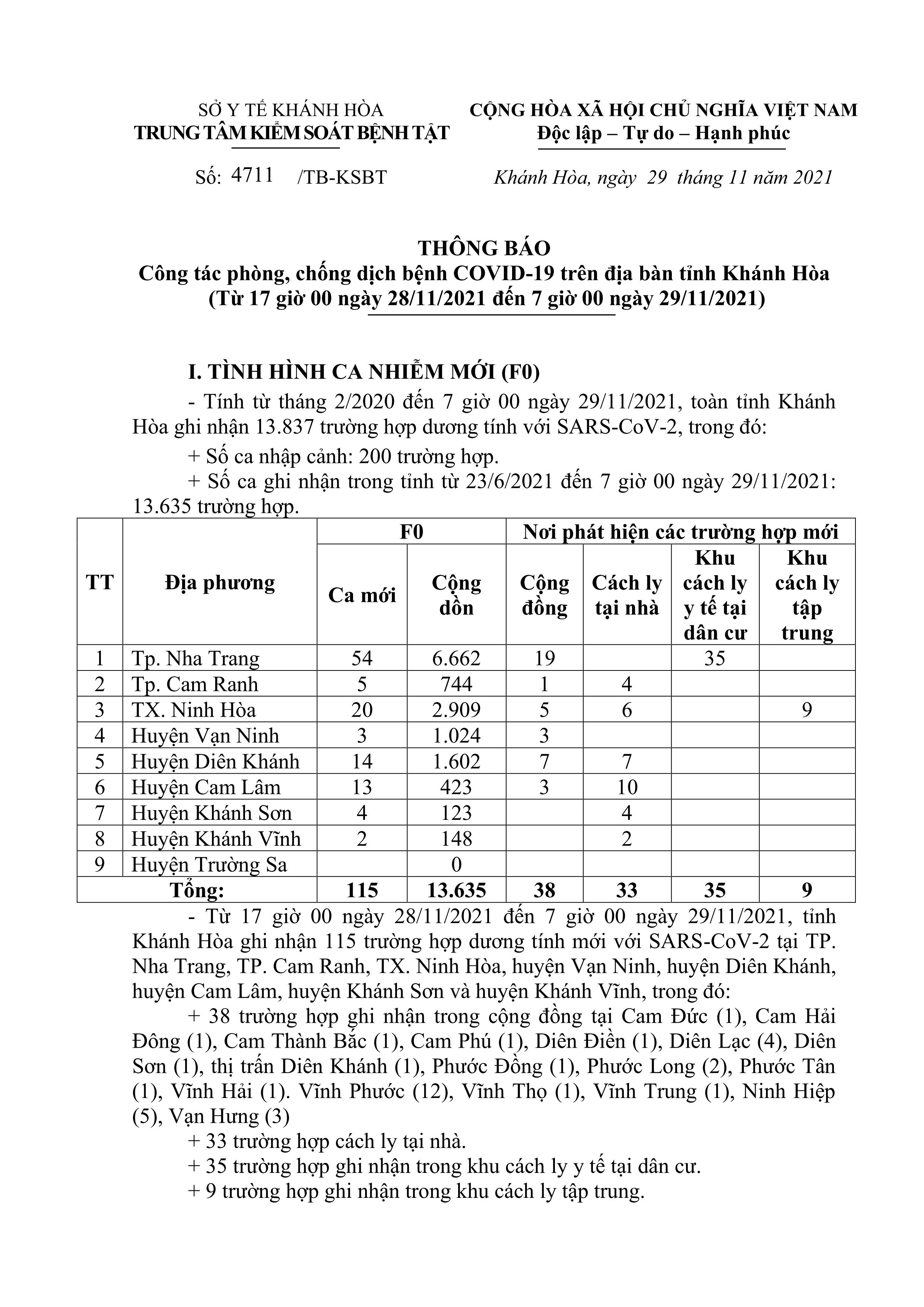 Sáng 29-11, theo Trung tâm Kiểm soát bệnh tật tỉnh Khánh Hòa, từ 17 giờ ngày 28-11 đến 7 giờ ngày 29-11, toàn tỉnh ghi nhận thêm 115 ca dương tính với SARS-CoV-2.