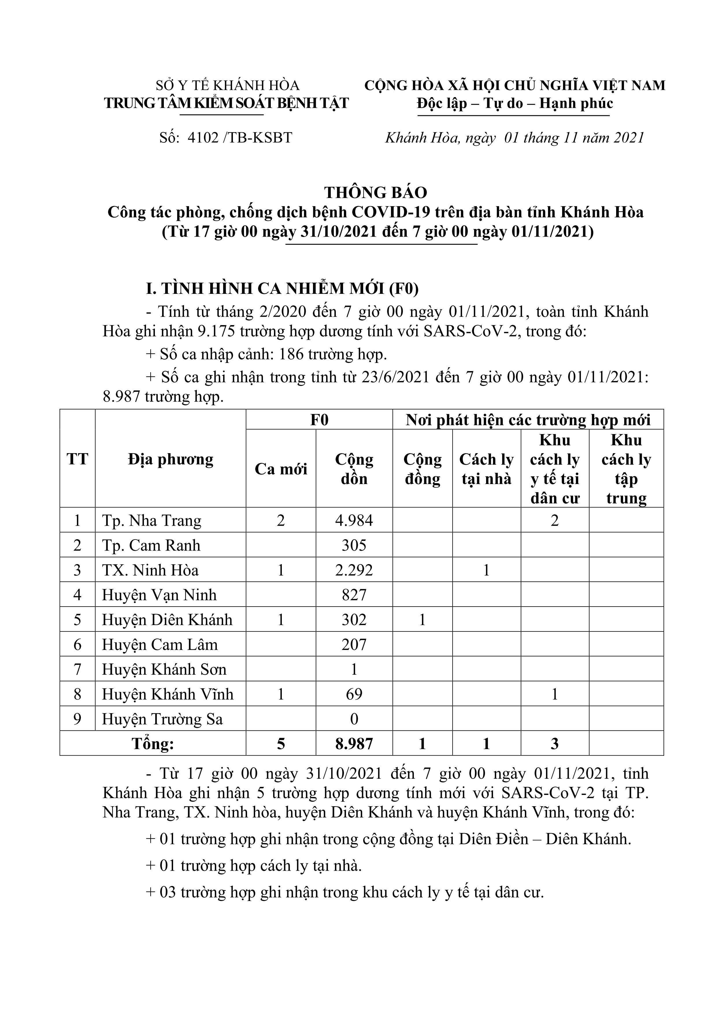 Sáng 1-11, theo Trung tâm Kiểm soát bệnh tật tỉnh Khánh Hòa, từ 17 giờ ngày 31-10 đến 7 giờ ngày 1-11, toàn tỉnh ghi nhận thêm 5 ca dương tính với SARS-CoV-2.