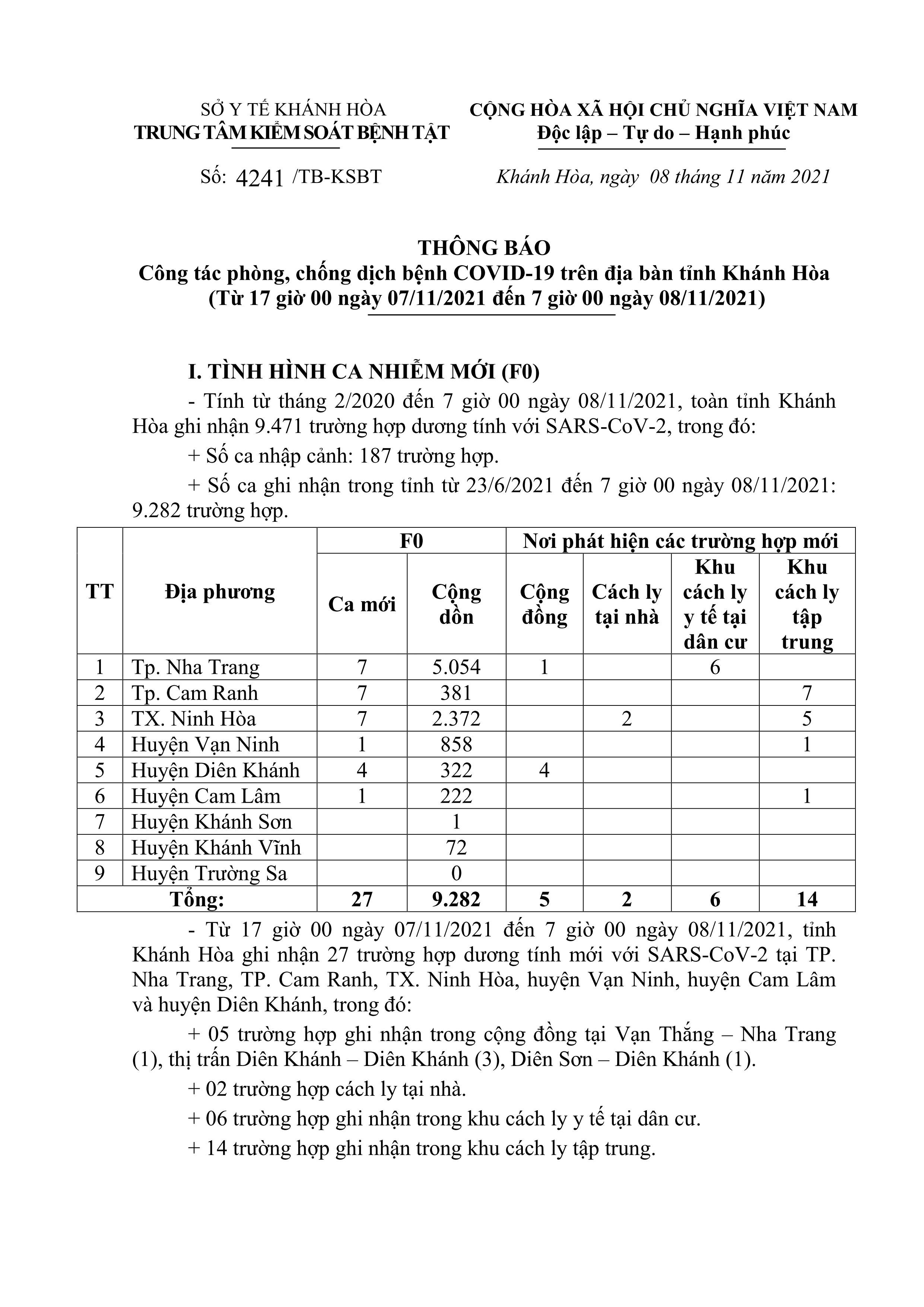 Sáng 8-11, theo Trung tâm Kiểm soát bệnh tật tỉnh Khánh Hòa, từ 17 giờ ngày 7-11 đến 7 giờ ngày 8-11, toàn tỉnh ghi nhận thêm 27 ca dương tính với SARS-CoV-2.