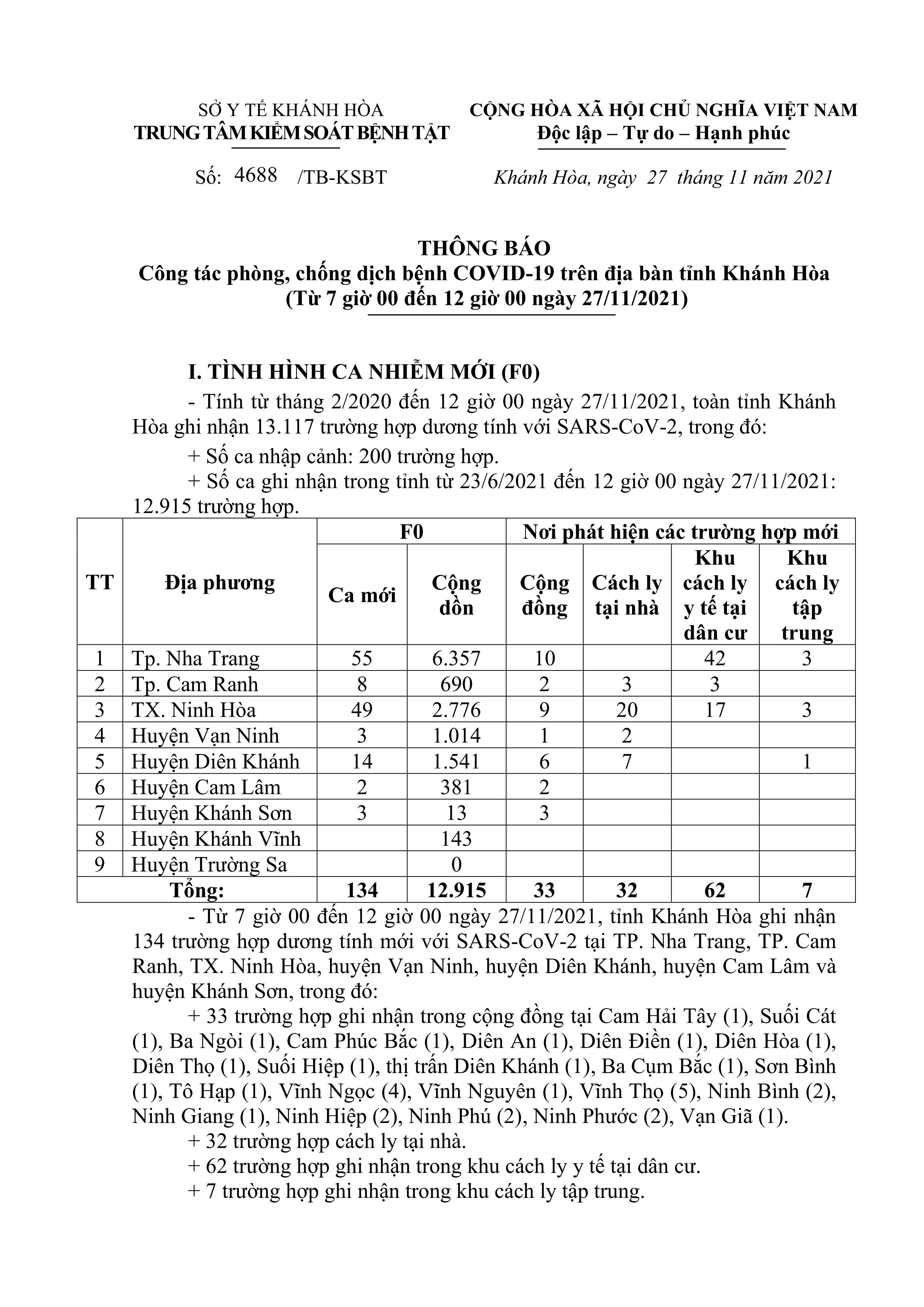 Trưa 27-11, theo Trung tâm Kiểm soát bệnh tật tỉnh Khánh Hòa, từ 7 giờ đến 12 giờ ngày 27-11, toàn tỉnh ghi nhận thêm 134 ca dương tính với SARS-CoV-2.