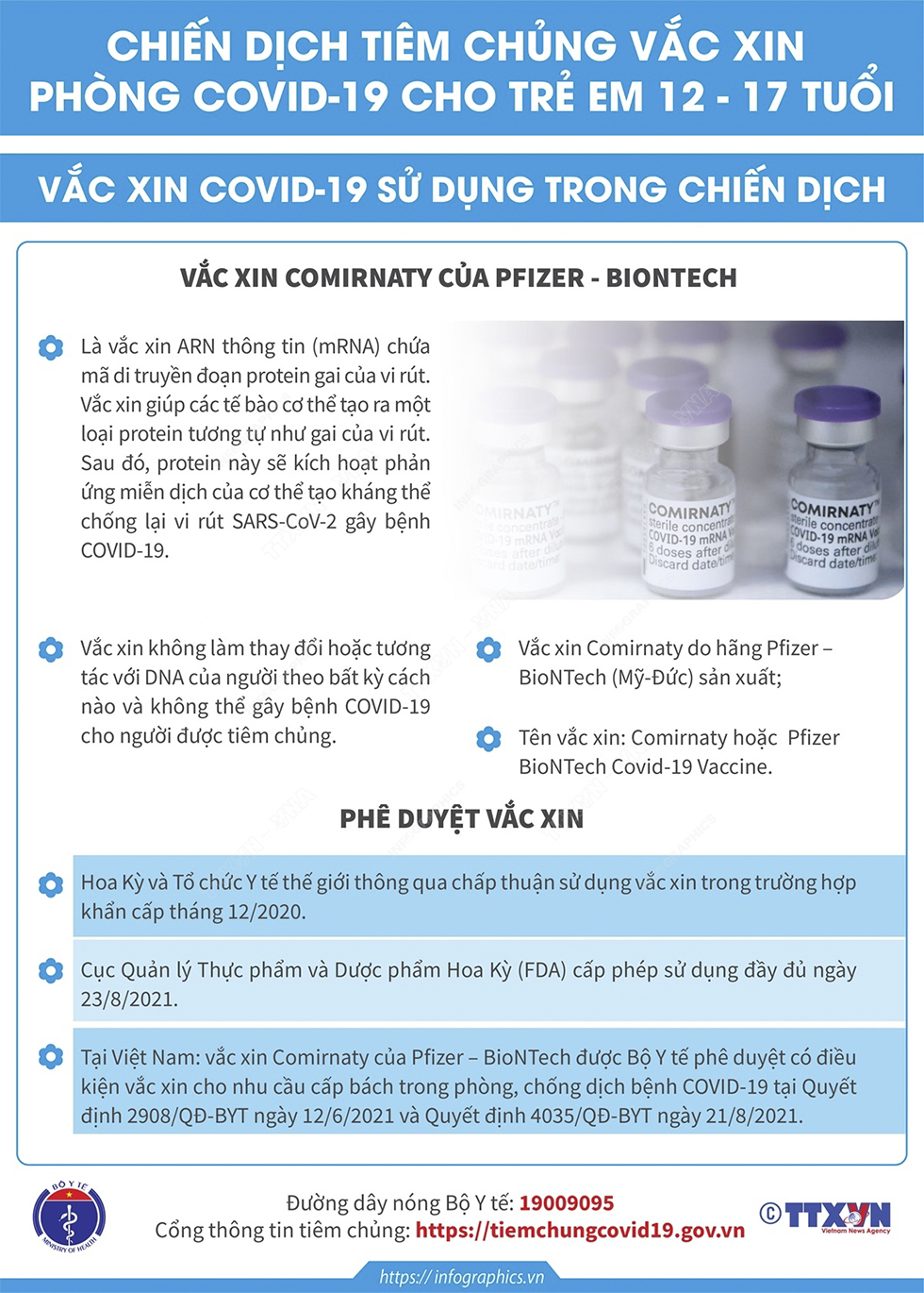 Vắc xin Comirnaty của Pfizer-BioNTech sử dụng trong chiến dịch tiêm chủng phòng COVID-19 cho trẻ em 12-17 tuổi do Mỹ-Đức sản xuất. Vắc xin không làm thay đổi hoặc tương tác với DNA của người theo bất kỳ cách nào và không thể gây bệnh COVID-19 cho người được tiêm chủng.