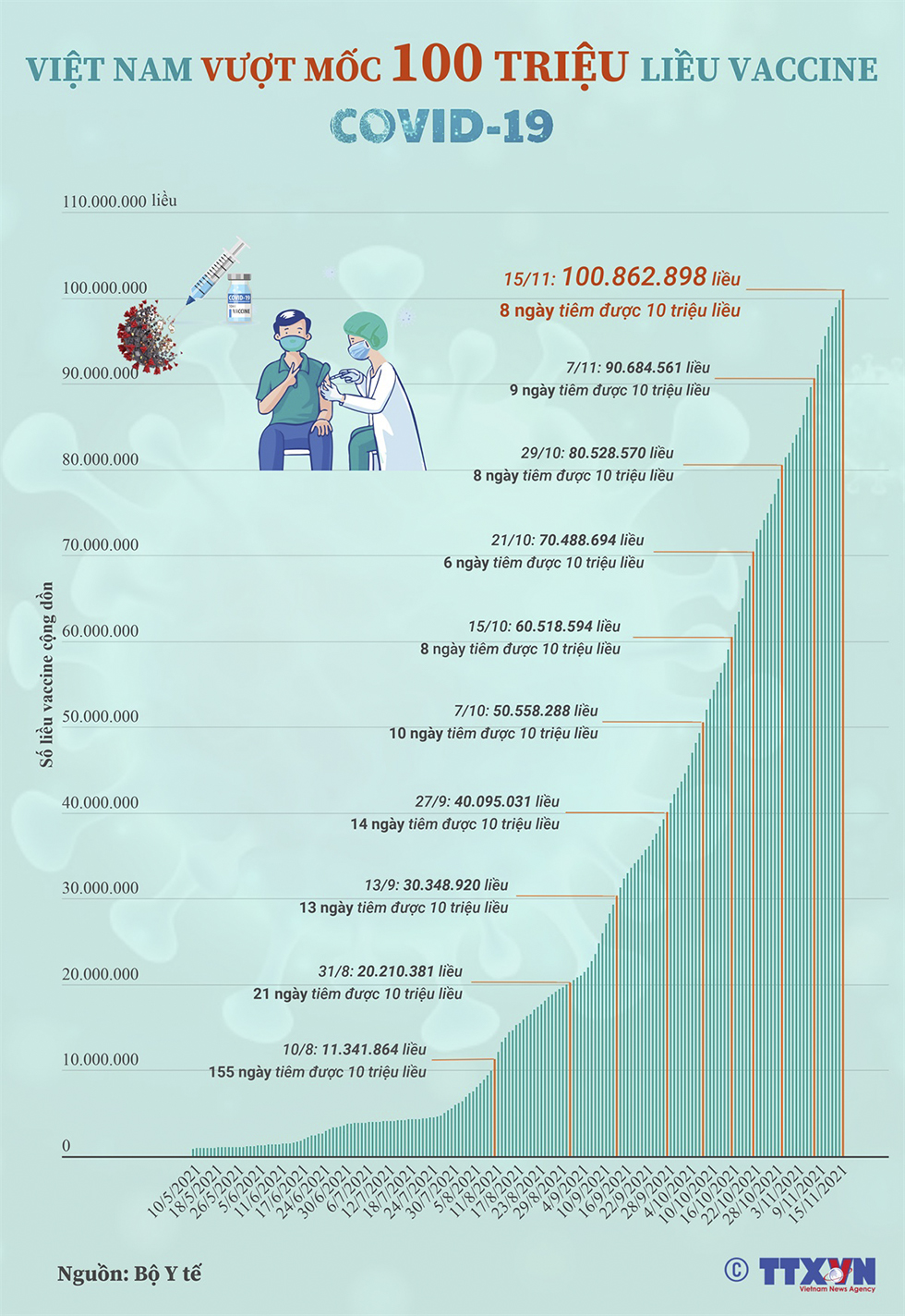 Theo số liệu trên Cổng thông tin tiêm chủng COVID-19, tính tới ngày 15/11/2021, Việt Nam đã vượt hơn 100,86 triệu liều vaccine COVID-19. Như vậy, Việt Nam đã hoàn thành được 2/3 mục tiêu 150 triệu liều trong nửa cuối của năm 2021 và đầu năm 2022 của chiến dịch tiêm chủng quy mô lớn nhất trong lịch sử tiêm chủng của đất nước.