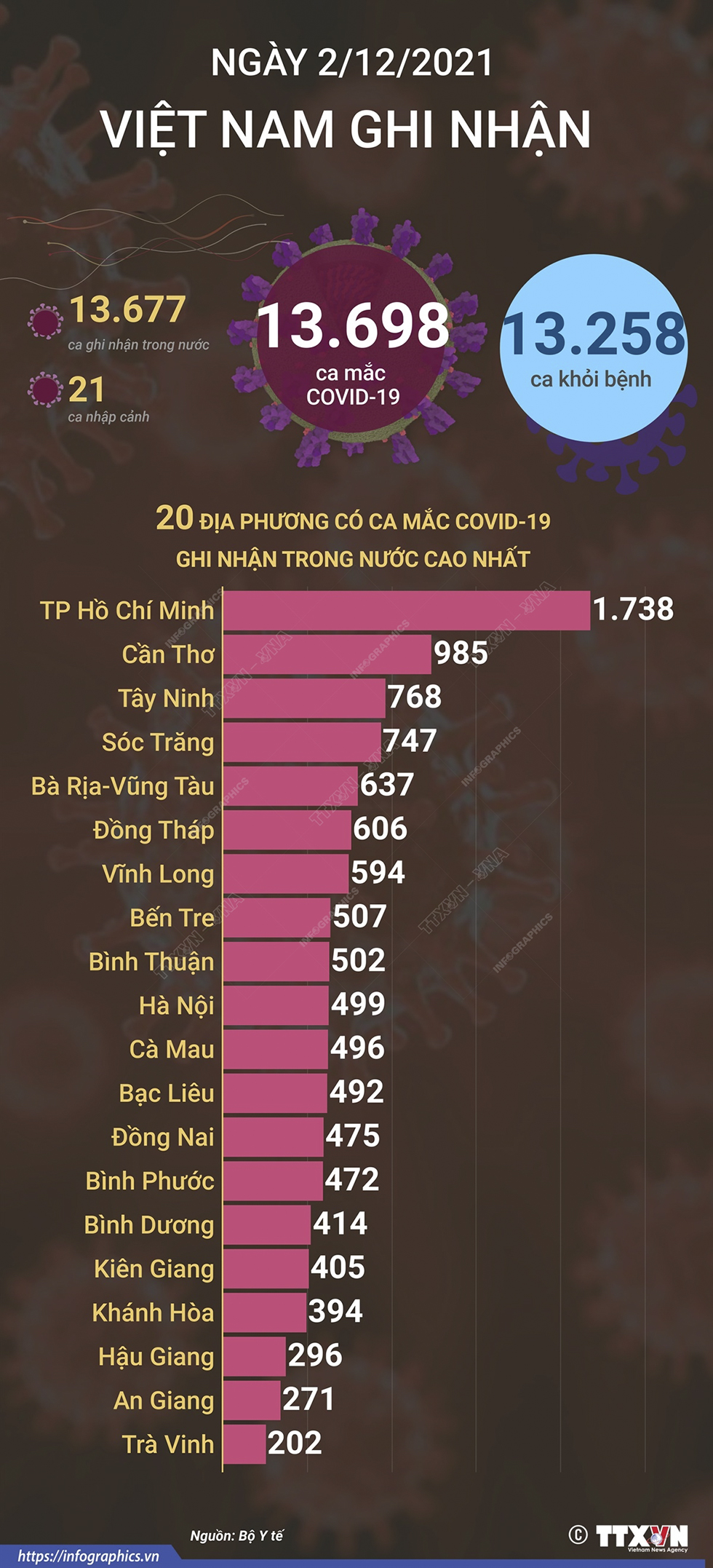 Tính từ 16h ngày 1/12 đến 16h ngày 2/12/2021, Việt Nam ghi nhận 13.698 ca mắc mới COVID-19, trong đó 21 ca nhập cảnh và 13.677 ca trong nước tại 60 tỉnh, thành phố. TP Hồ Chí Minh ghi nhận 1.738 ca, Cần Thơ 985 ca, Tây Ninh 768 ca...
