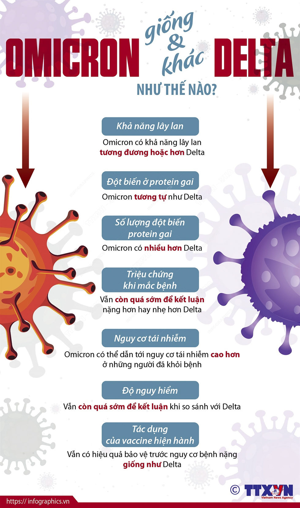 Hiện các nhà khoa học trên toàn thế giới đang chạy đua để "giải mã" Omicron - biến thể mới của virus SARS-CoV-2 gây đại dịch COVID-19. Cho đến nay, giới nghiên cứu đã chỉ ra một số đặc điểm giống và khác nhau giữa biến thể này và biến thể Delta đang là biến thể gây bệnh chủ đạo trên thế giới.