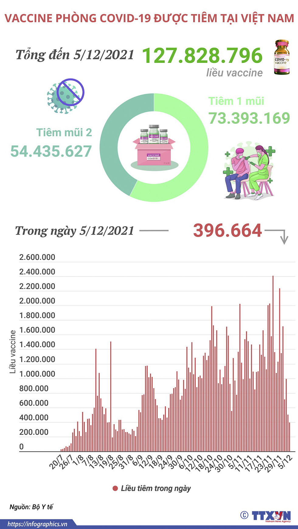 Trong ngày 5/12/2021 có 396.664 liều vaccine phòng COVID-19 được tiêm. Như vậy, tổng số liều vaccine đã được tiêm tại Việt Nam là 127.828.796 liều, trong đó tiêm 1 mũi là 73.393.169 liều, tiêm mũi 2 là 54.435.627.