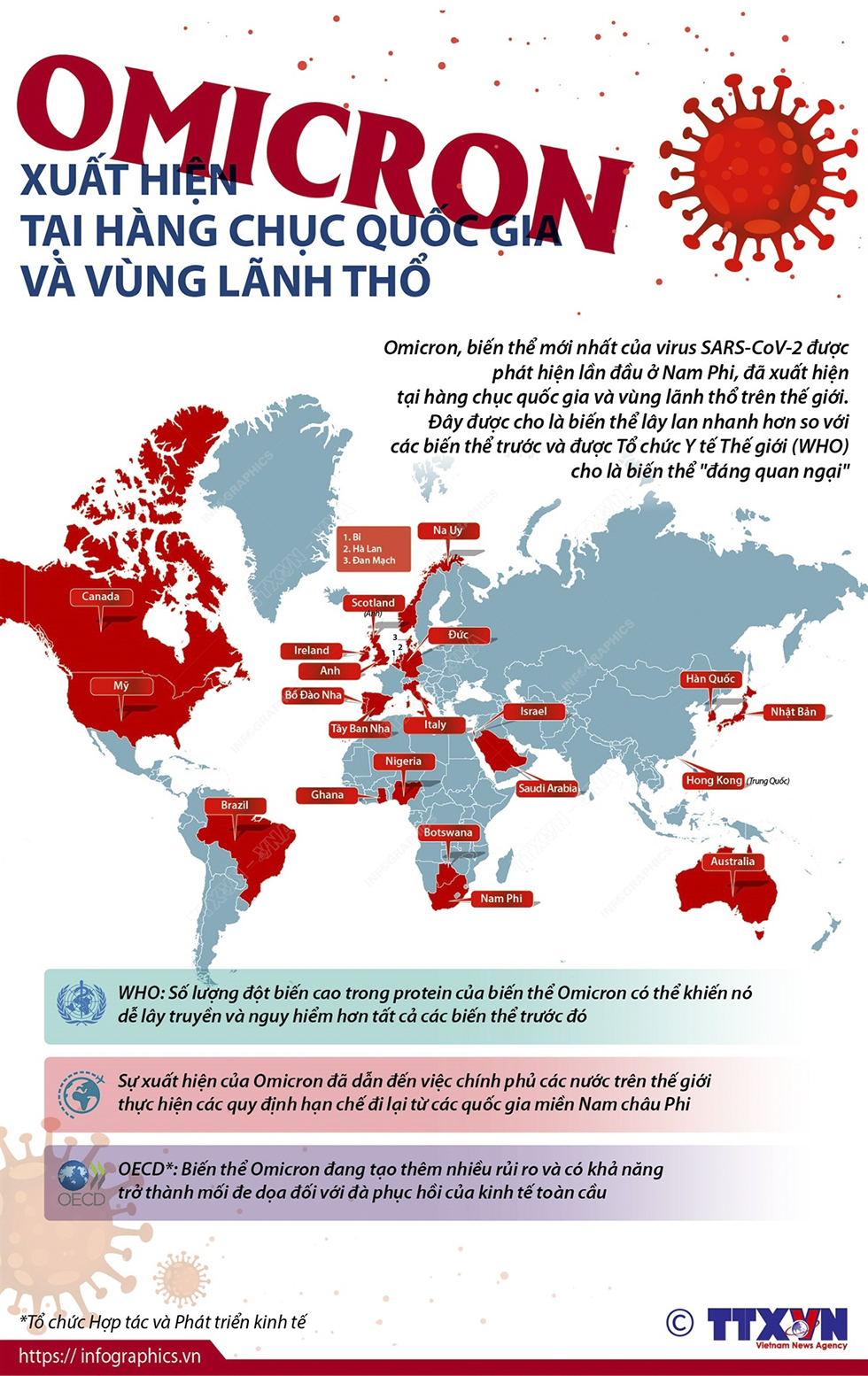 Omicron, biến thể mới nhất của virus SARS-CoV-2 được phát hiện lần đầu ở Nam Phi, đã xuất hiện tại hàng chục quốc gia và vùng lãnh thổ trên thế giới. Đây được cho là biến thể lây lan nhanh hơn so với các biến thể trước và được Tổ chức Y tế Thế giới (WHO) cho là biến thể "đáng quan ngại".