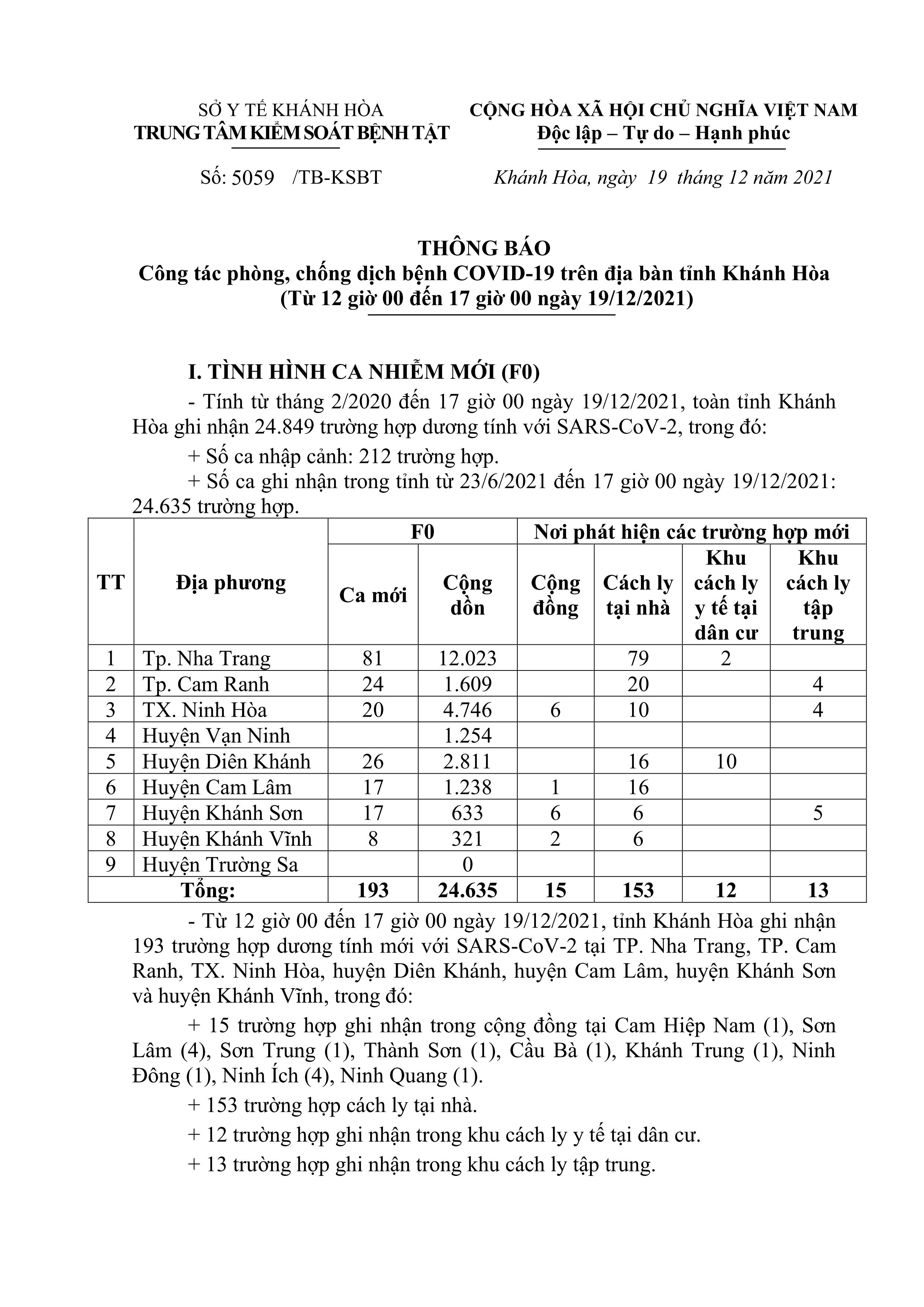 Chiều 19-12, theo Trung tâm Kiểm soát bệnh tật tỉnh Khánh Hòa, từ 12 giờ đến 17 giờ cùng ngày, toàn tỉnh ghi nhận thêm 193 ca dương tính với SARS-CoV-2.