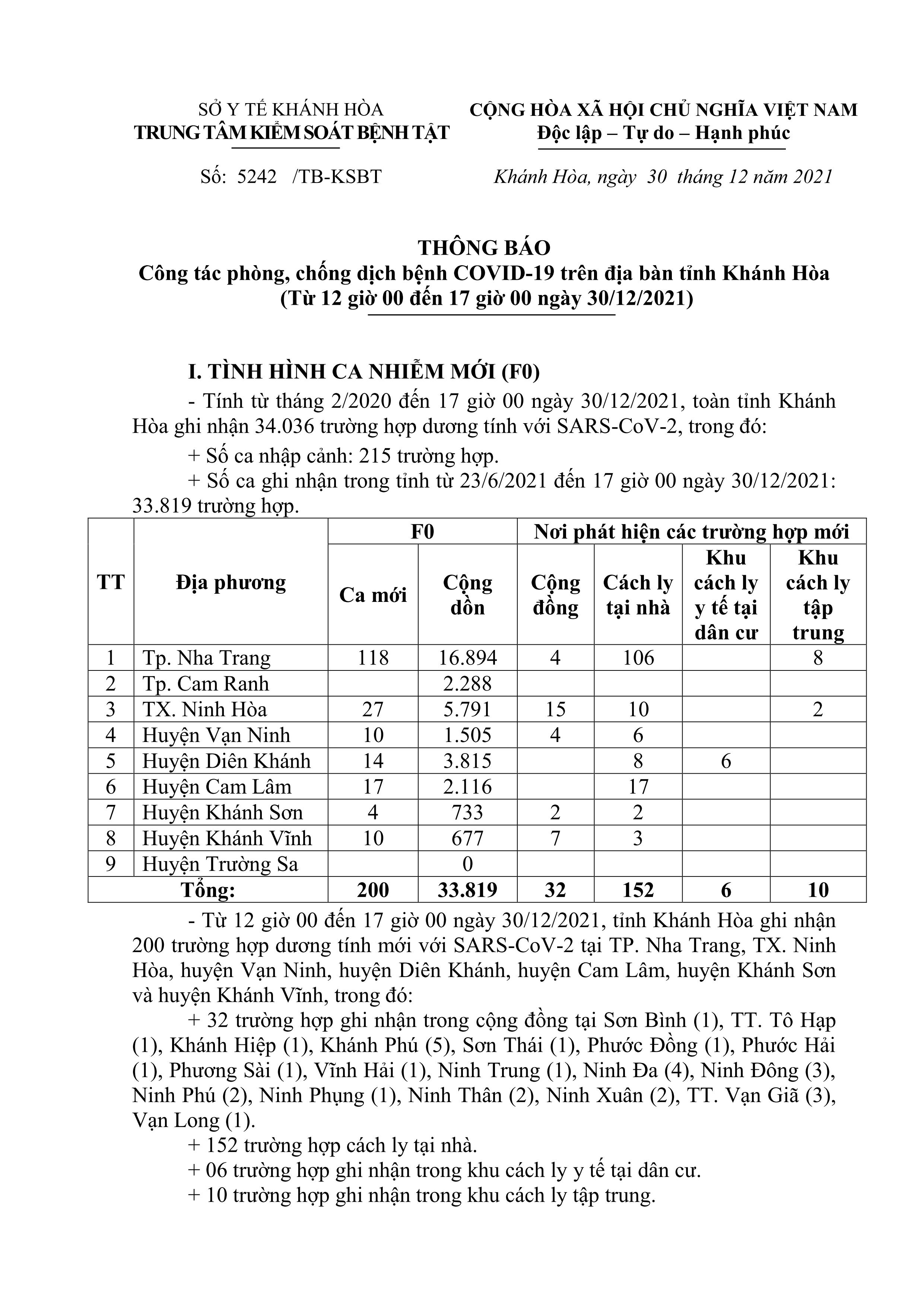 Chiều 30-12, theo Trung tâm Kiểm soát bệnh tật tỉnh Khánh Hòa, từ 12 giờ đến 17 giờ cùng ngày, toàn tỉnh ghi nhận thêm 200 ca dương tính với SARS-CoV-2.
