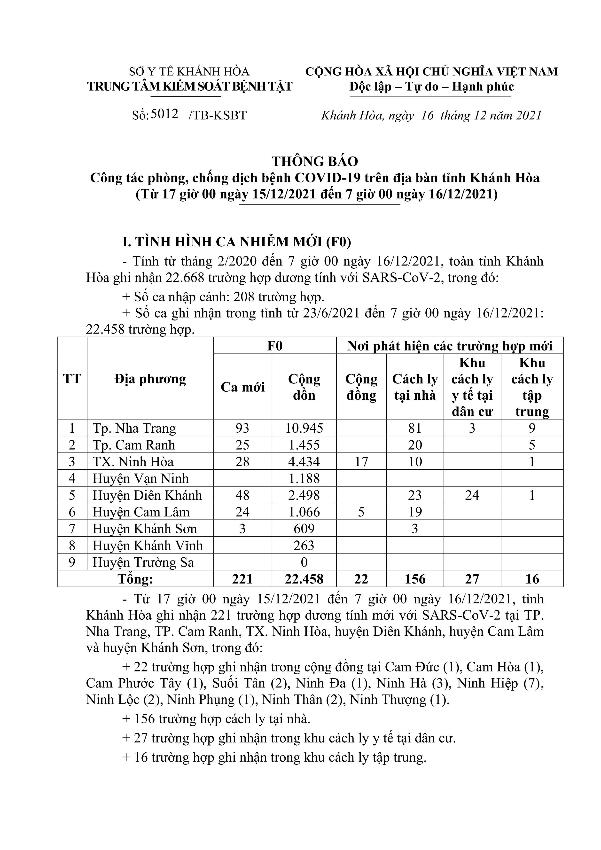 Sáng 16-12, theo Trung tâm Kiểm soát bệnh tật tỉnh Khánh Hòa, từ 17 giờ ngày 15-12 đến 7 giờ ngày 16-12, toàn tỉnh ghi nhận thêm 221 ca dương tính với SARS-CoV-2.