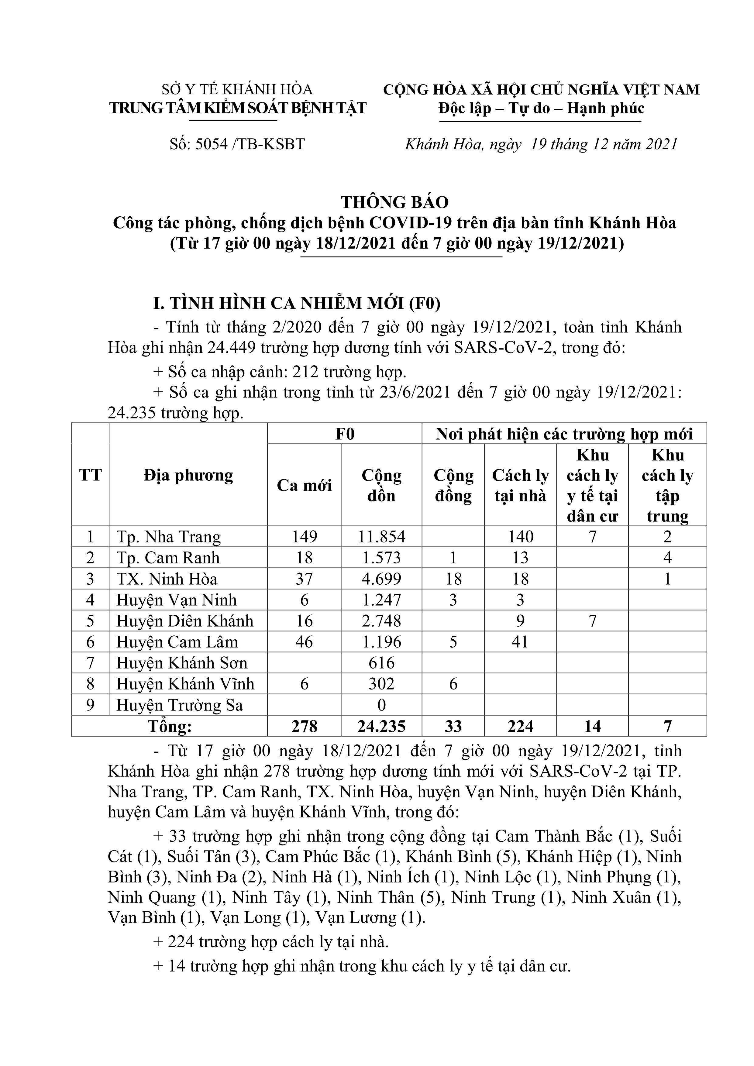Sáng 19-12, theo Trung tâm Kiểm soát bệnh tật tỉnh Khánh Hòa, từ 17 giờ ngày 18-12 đến 7 giờ ngày 19-12, toàn tỉnh ghi nhận thêm 278 ca dương tính với SARS-CoV-2.