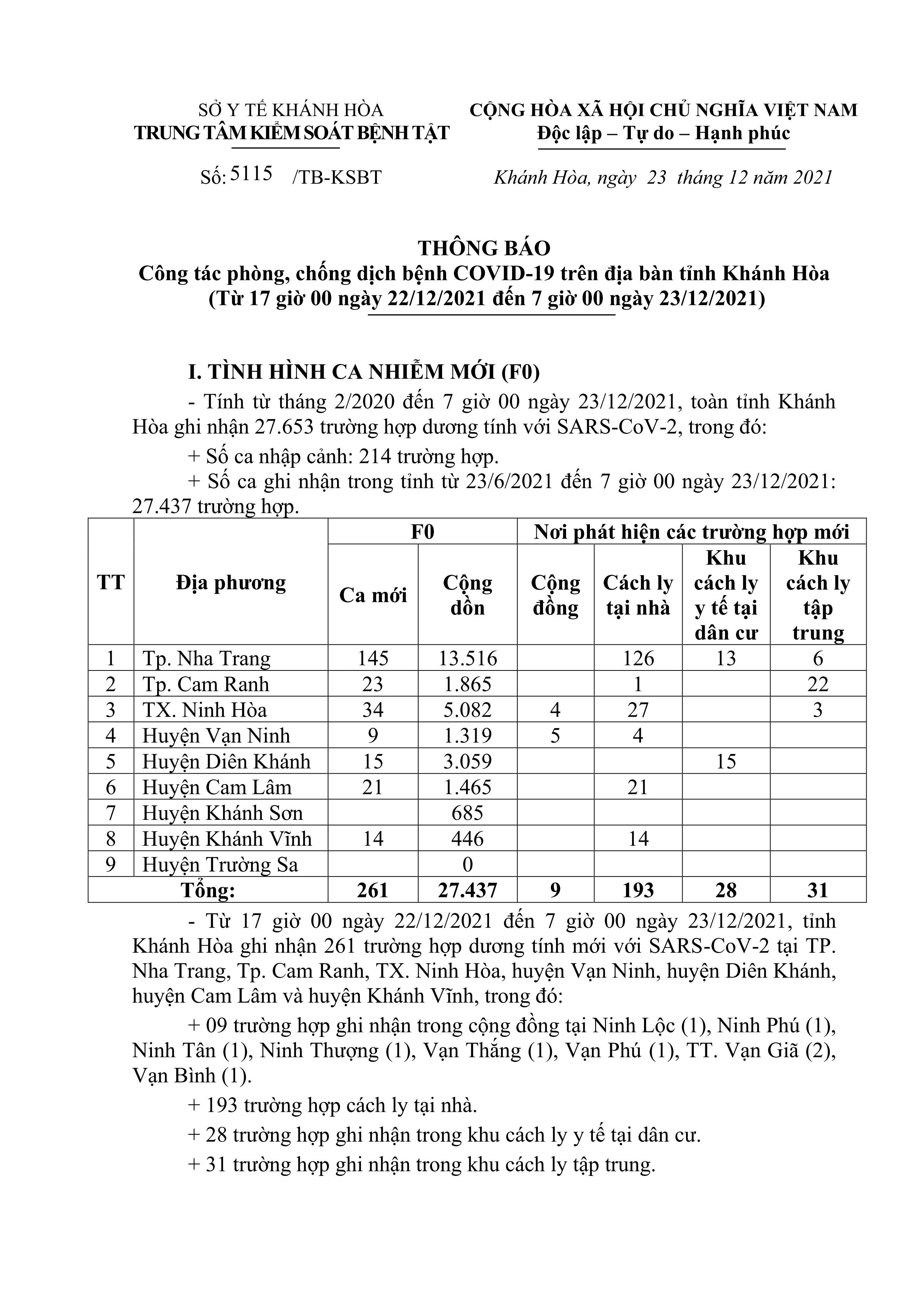 Sáng 23-12, theo Trung tâm Kiểm soát bệnh tật tỉnh Khánh Hòa, từ 17 giờ ngày 22-12 đến 7 giờ ngày 23-12, toàn tỉnh ghi nhận thêm 261 ca dương tính với SARS-CoV-2.