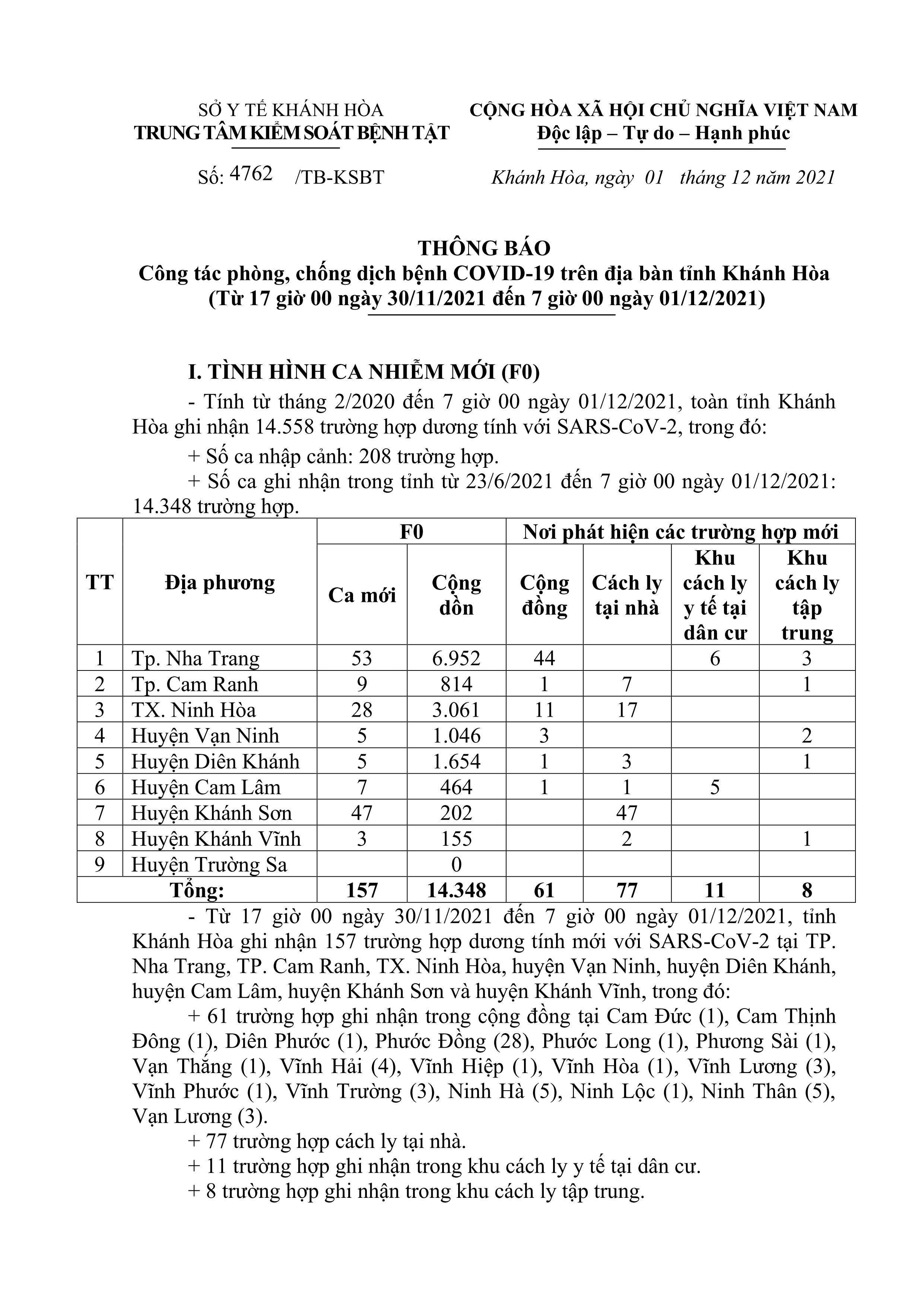 Sáng 1-12, theo Trung tâm Kiểm soát bệnh tật tỉnh Khánh Hòa, từ 17 giờ ngày 30-11 đến 7 giờ ngày 1-12, toàn tỉnh ghi nhận thêm 157 ca dương tính với SARS-CoV-2.