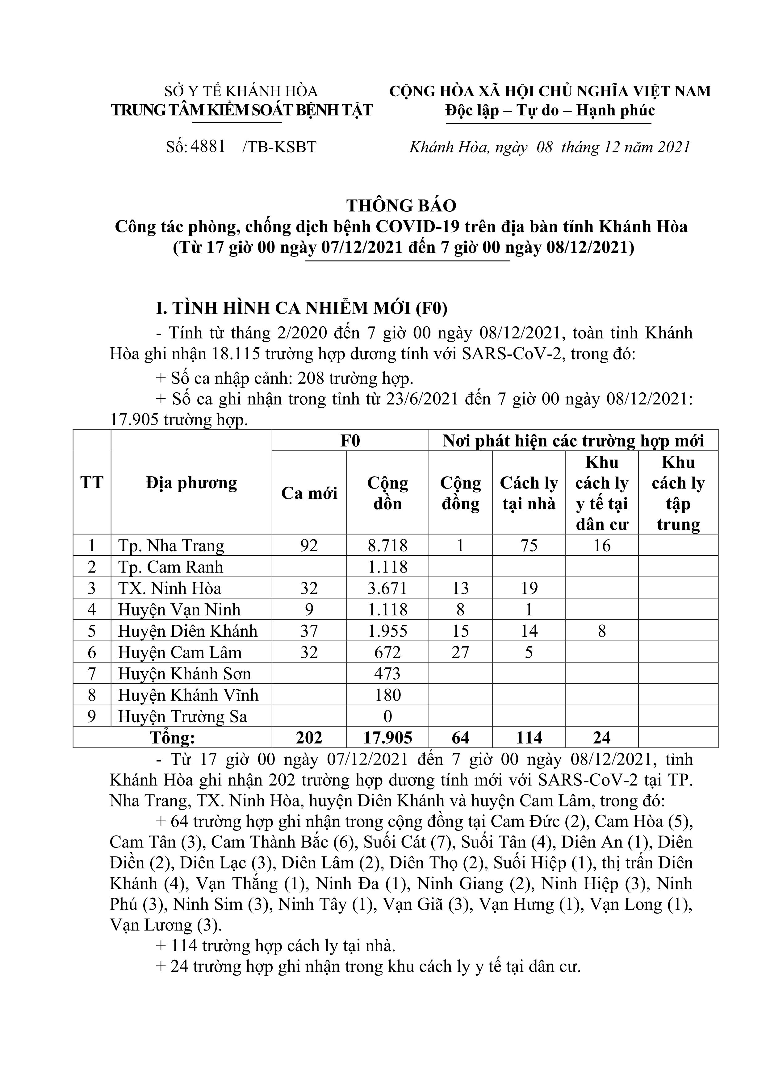 Sáng 8-12, theo Trung tâm Kiểm soát bệnh tật tỉnh Khánh Hòa, từ 17 giờ ngày 7-12 đến 7 giờ ngày 8-12, toàn tỉnh ghi nhận thêm 202 ca dương tính với SARS-CoV-2.