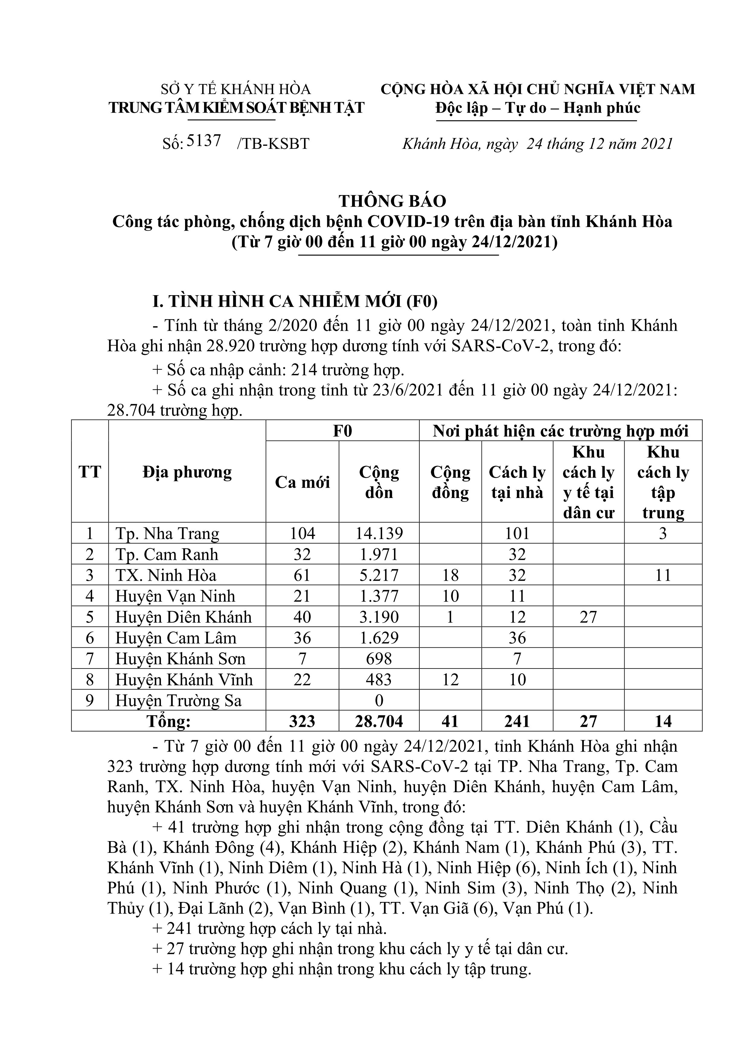 Trưa 24-12, theo Trung tâm Kiểm soát bệnh tật tỉnh Khánh Hòa, từ 7 giờ đến 11 giờ ngày 24-12, toàn tỉnh ghi nhận thêm 323 ca dương tính với SARS-CoV-2.